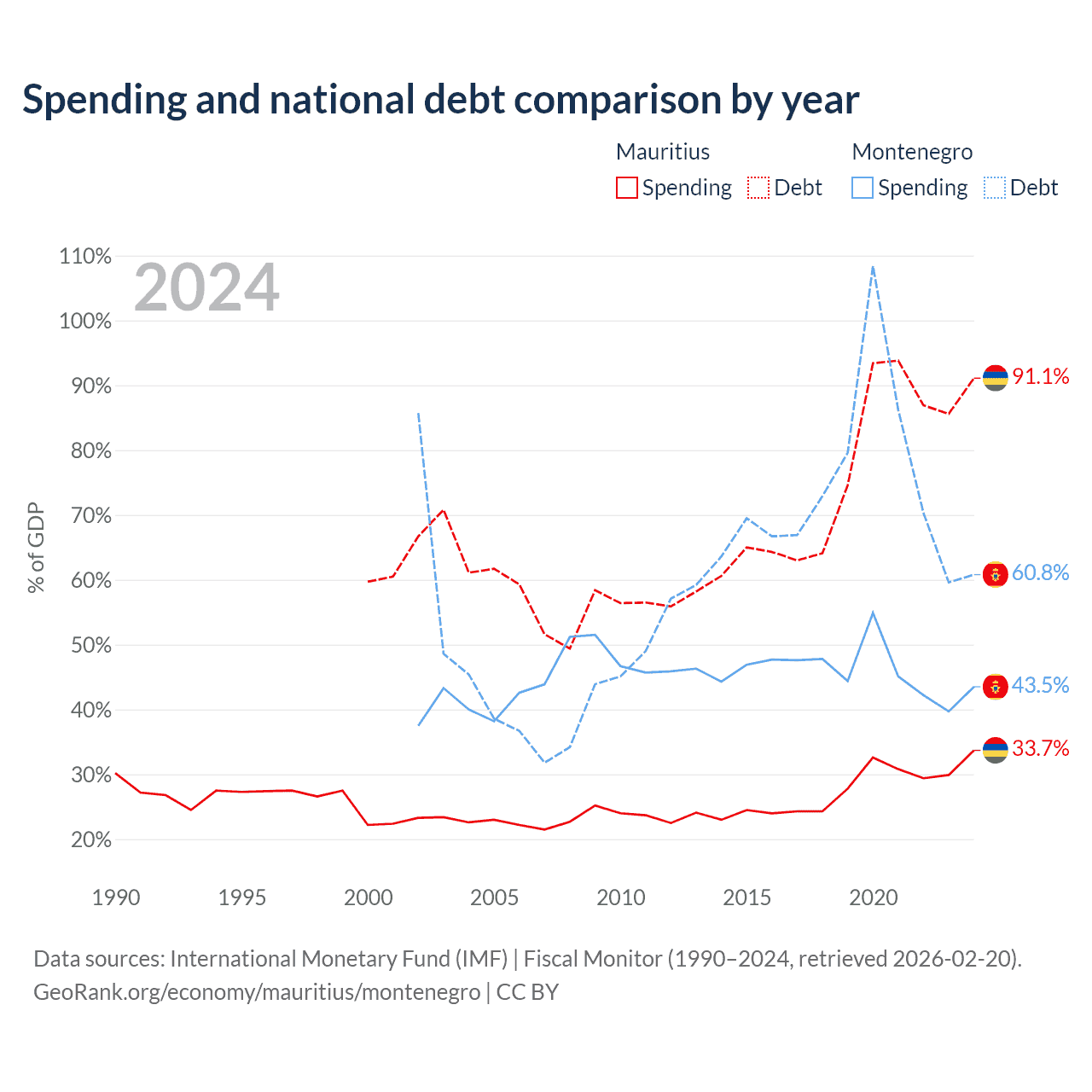 Mauritius has $13.6B in government debt (91.1% of GDP), compared to $5.02B (60.8% of GDP) in Montenegro.