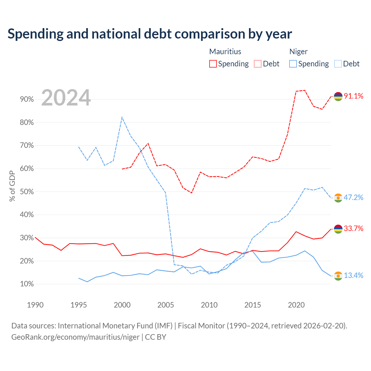 Mauritius has $13.6B in government debt (91.1% of GDP), compared to $9.39B (47.2% of GDP) in Niger.