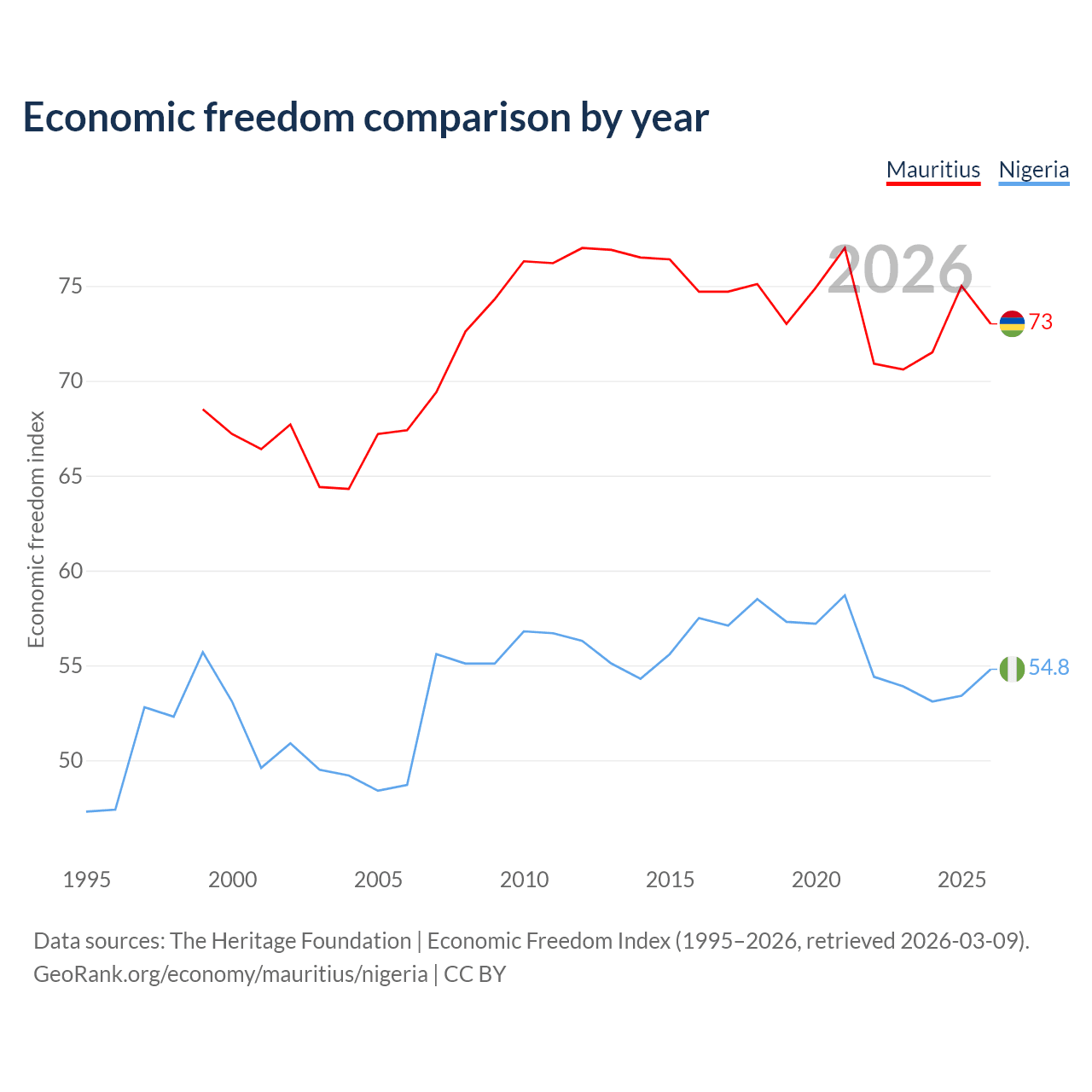 The Economic Freedom Index for Mauritius is 73, ranking 26/197, compared to 54.8 for Nigeria, ranking 132/197. The chart above displays a comparison of annual changes in economic freedom indexes.