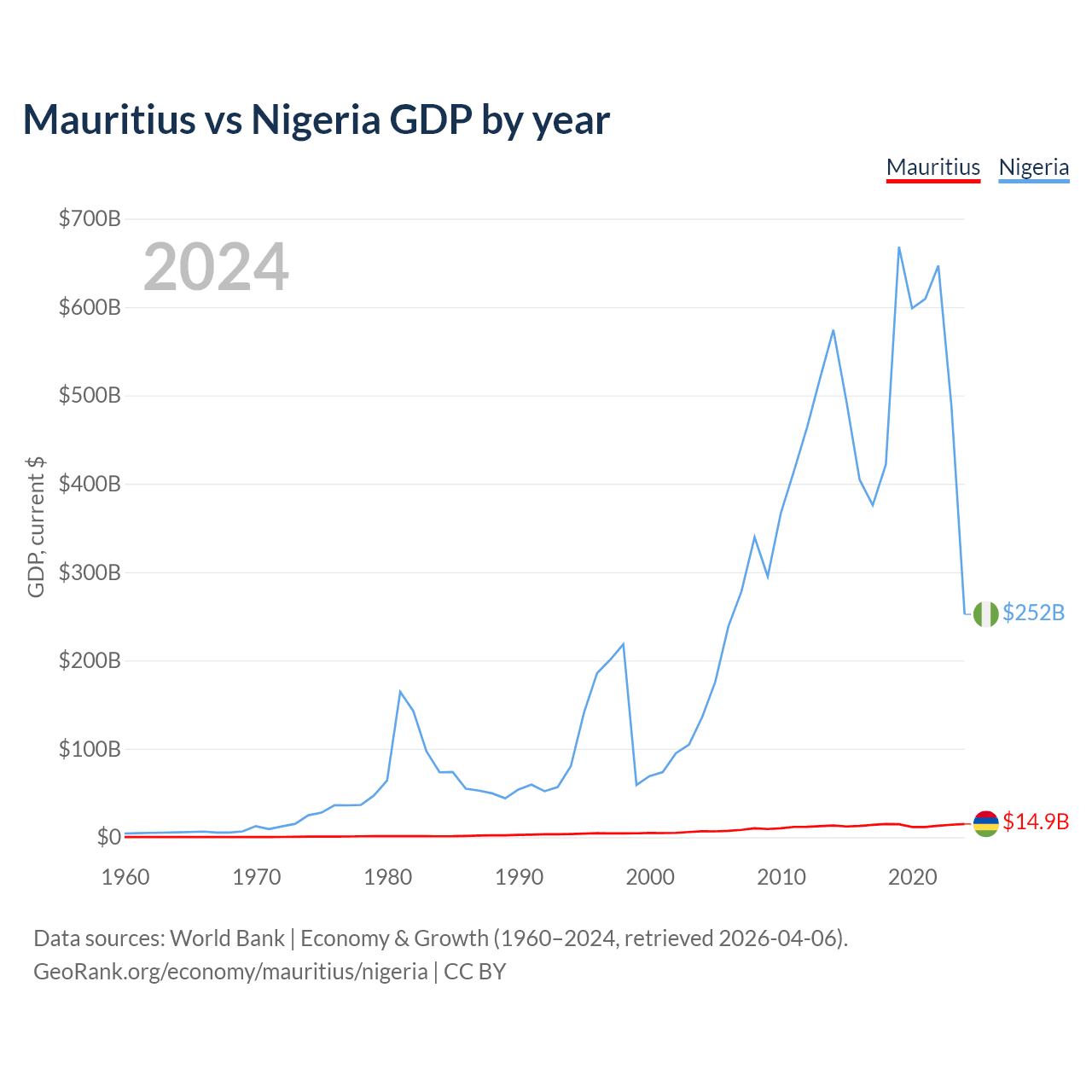 Mauritius has a GDP of $14.9B compared to $252B for Nigeria, ranking 143/197 and 54/197 by economy size, respectively.