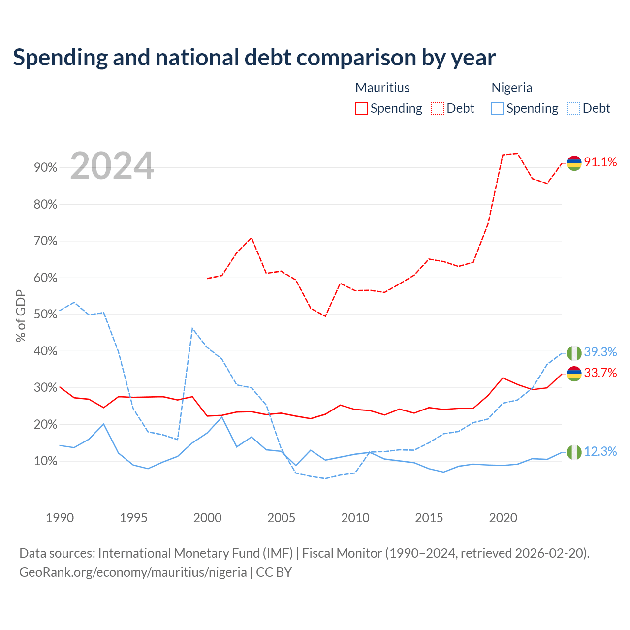 Mauritius has $13.6B in government debt (91.1% of GDP), compared to $99.2B (39.3% of GDP) in Nigeria.