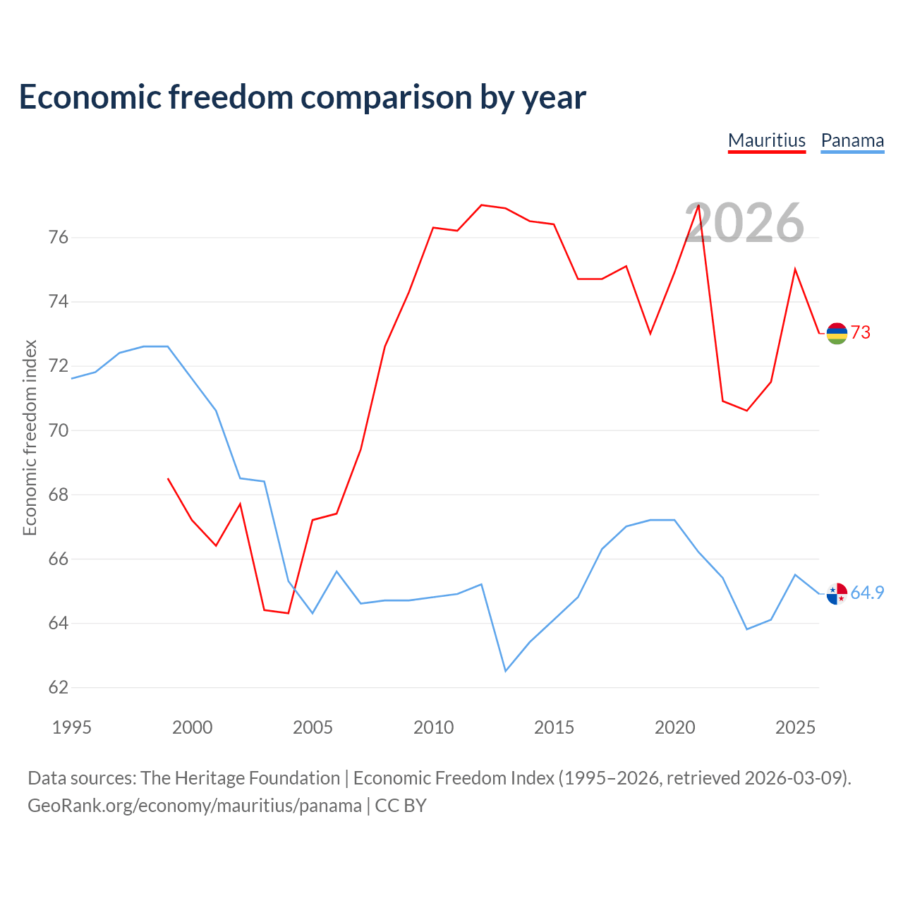 The Economic Freedom Index for Mauritius is 73, ranking 26/197, compared to 64.9 for Panama, ranking 70/197. The chart above displays a comparison of annual changes in economic freedom indexes.