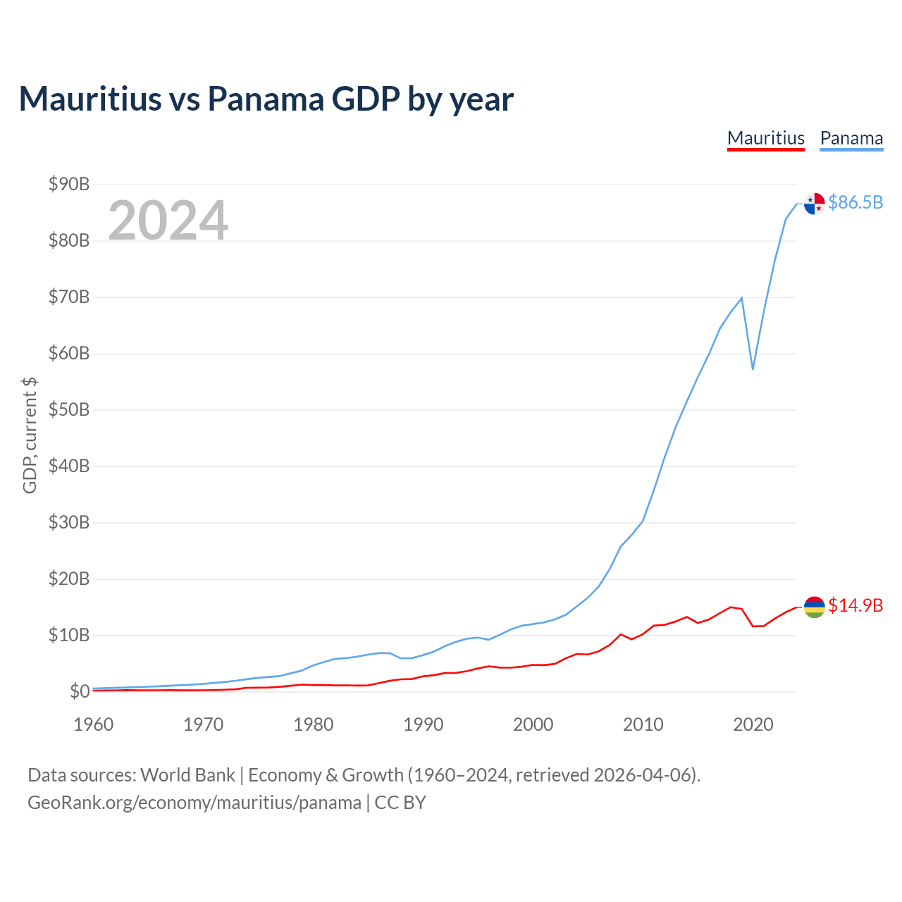 Mauritius has a GDP of $14.9B compared to $86.5B for Panama, ranking 143/197 and 78/197 by economy size, respectively.