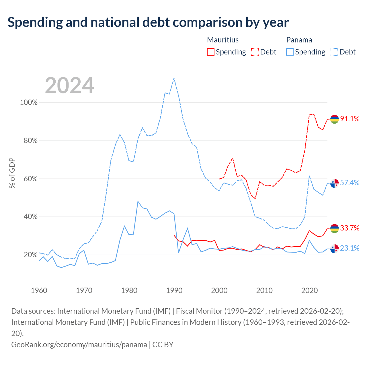 Mauritius has $13.6B in government debt (91.1% of GDP), compared to $49.6B (57.4% of GDP) in Panama.
