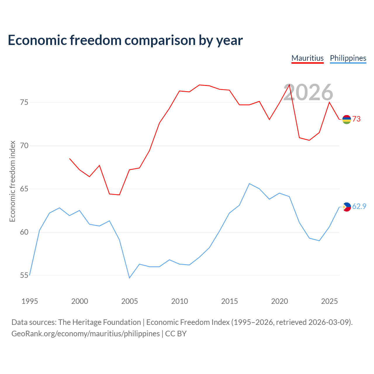 The Economic Freedom Index for Mauritius is 73, ranking 26/197, compared to 62.9 for the Philippines, ranking 85/197. The chart above displays a comparison of annual changes in economic freedom indexes.
