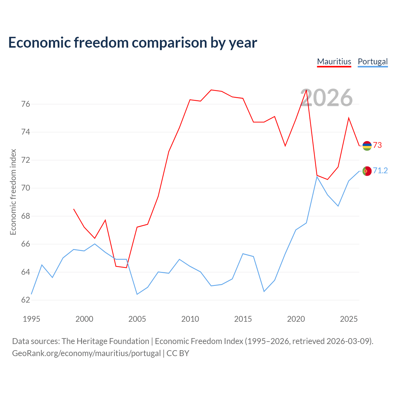 The Economic Freedom Index for Mauritius is 73, ranking 26/197, compared to 71.2 for Portugal, ranking 33/197. The chart above displays a comparison of annual changes in economic freedom indexes.