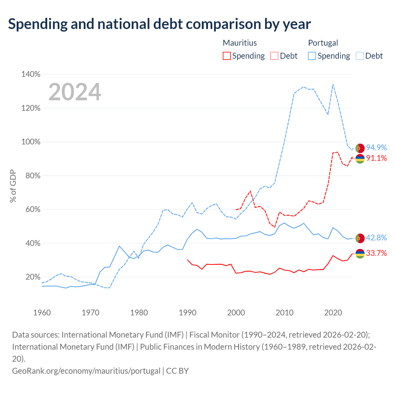 Mauritius has $13.6B in government debt (91.1% of GDP), compared to $297B (94.9% of GDP) in Portugal.