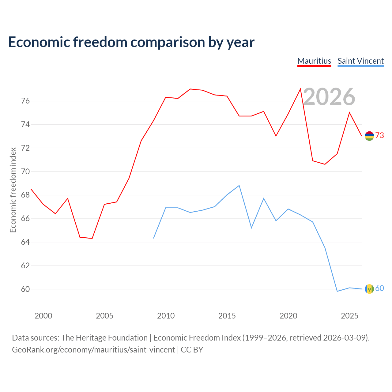 The Economic Freedom Index for Mauritius is 73, ranking 26/197, compared to 60 for Saint Vincent, ranking 98/197. The chart above displays a comparison of annual changes in economic freedom indexes.