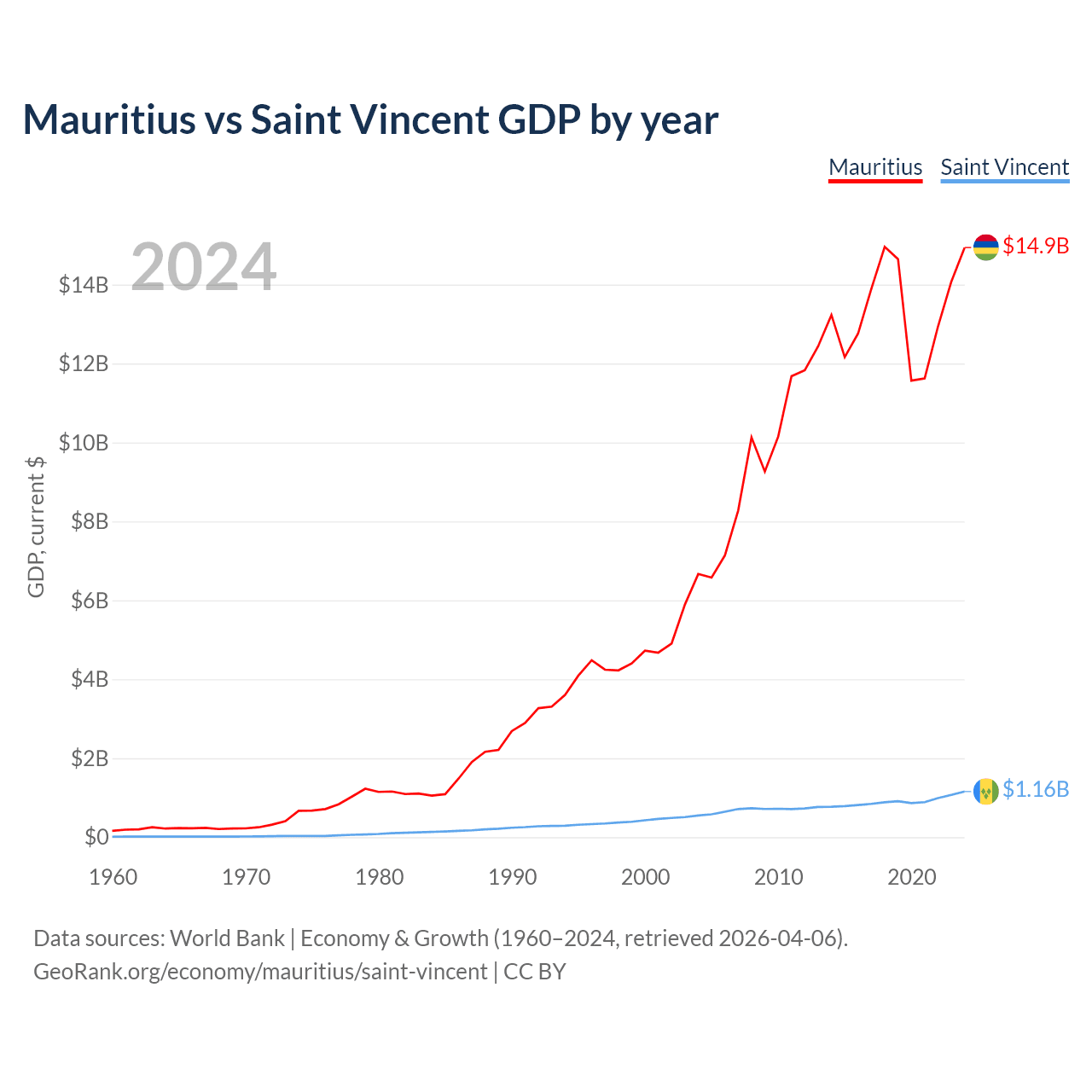 Mauritius has a GDP of $14.9B compared to $1.16B for Saint Vincent, ranking 143/197 and 186/197 by economy size, respectively.