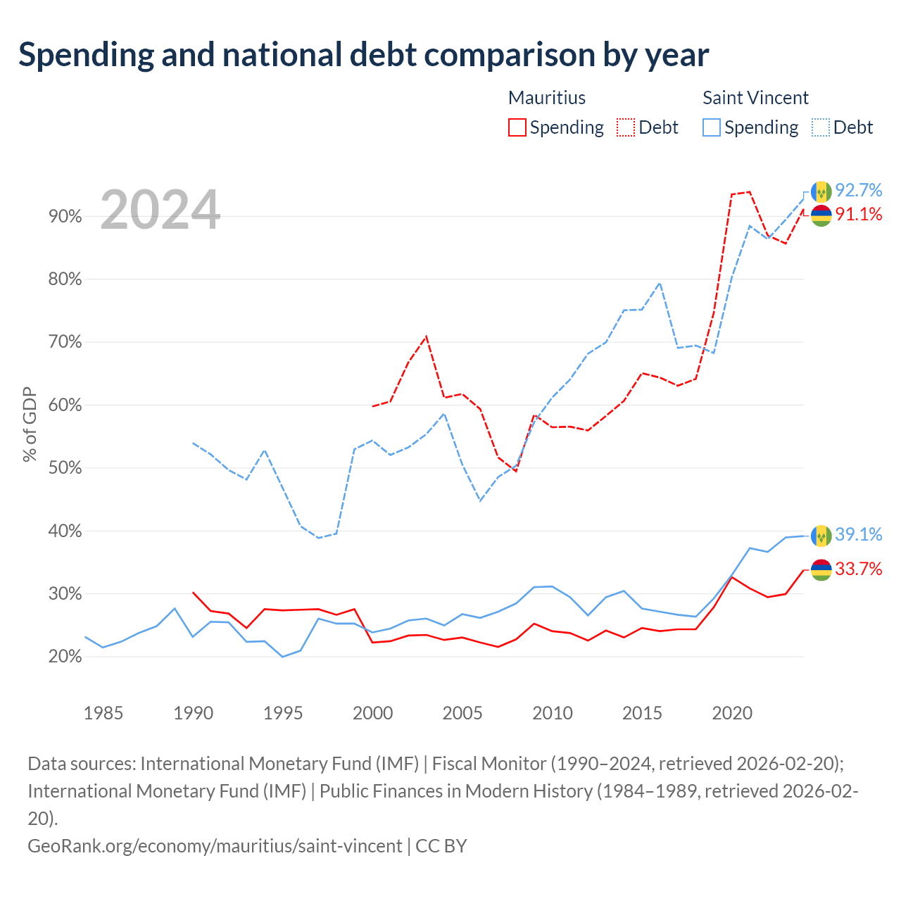 Mauritius has $13.6B in government debt (91.1% of GDP), compared to $1.07B (92.7% of GDP) in Saint Vincent.