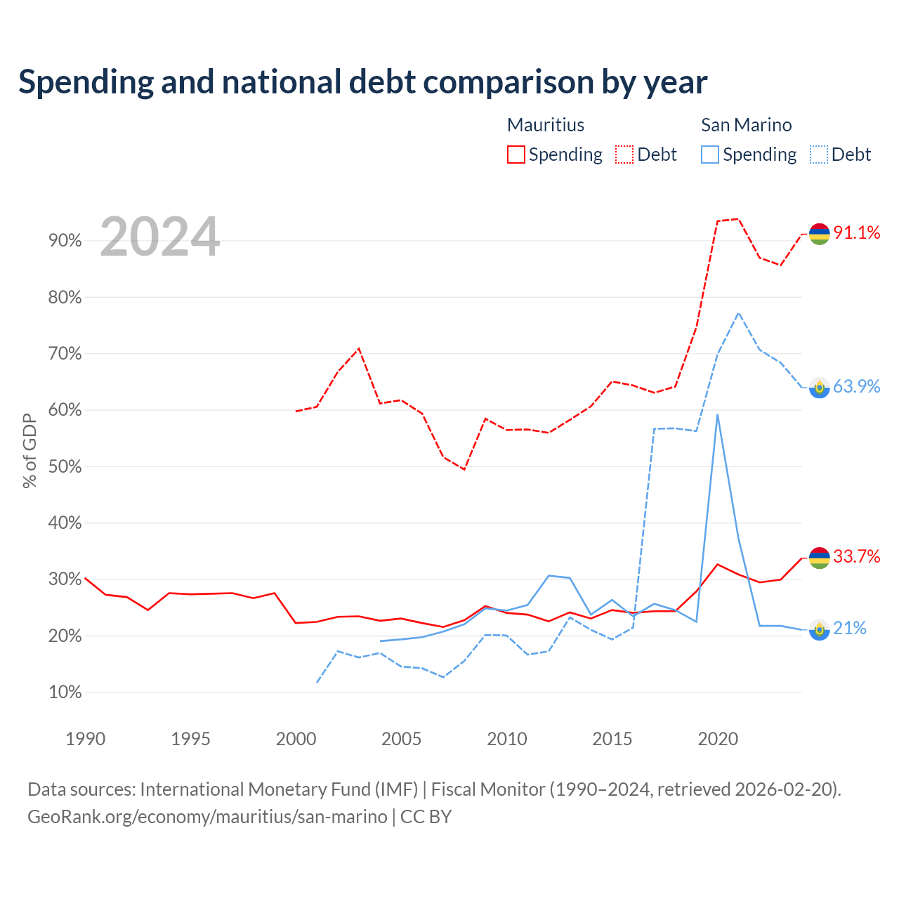 Mauritius has $13.6B in government debt (91.1% of GDP), compared to $1.39B (63.9% of GDP) in San Marino.