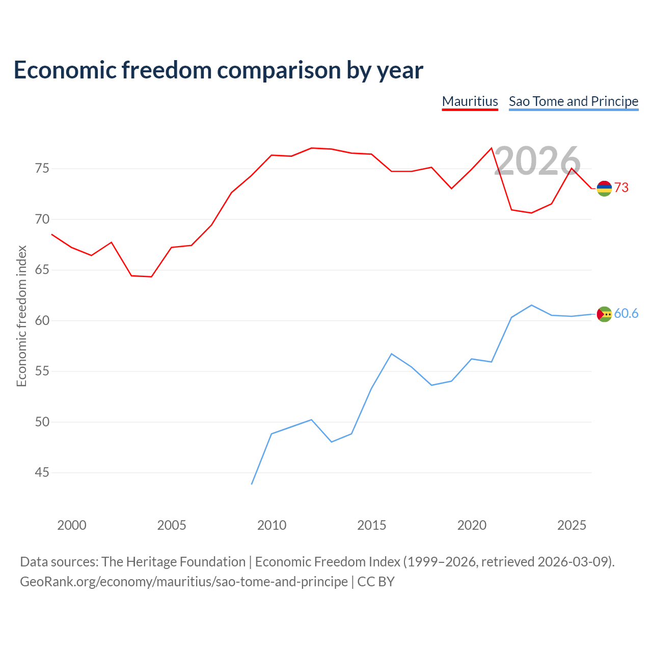 The Economic Freedom Index for Mauritius is 73, ranking 26/197, compared to 60.6 for Sao Tome and Principe, ranking 93/197. The chart above displays a comparison of annual changes in economic freedom indexes.