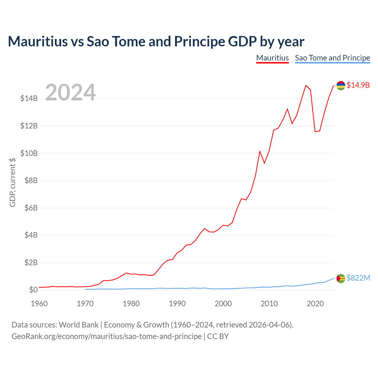 Mauritius has a GDP of $14.9B compared to $822M for Sao Tome and Principe, ranking 143/197 and 189/197 by economy size, respectively.