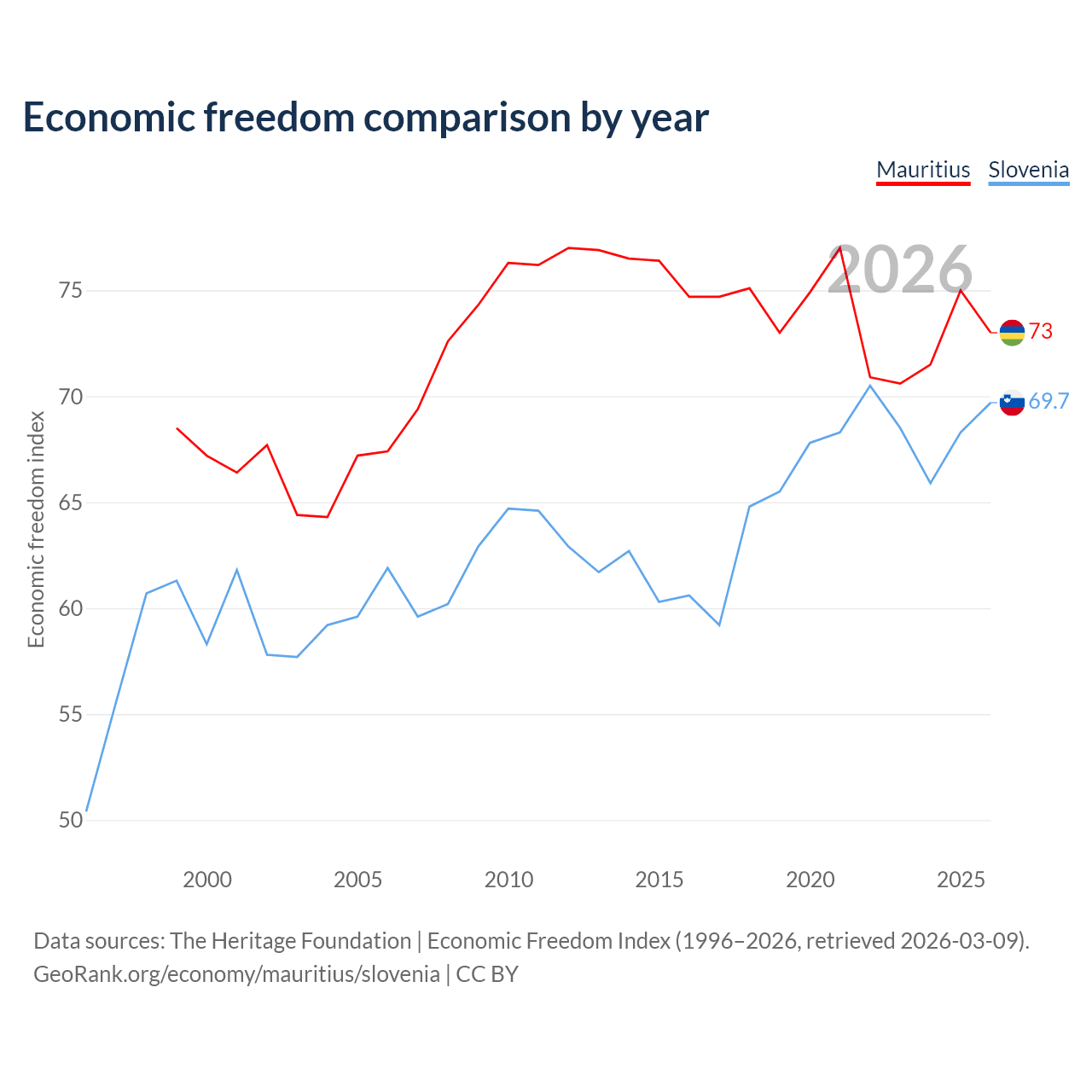 The Economic Freedom Index for Mauritius is 73, ranking 26/197, compared to 69.7 for Slovenia, ranking 40/197. The chart above displays a comparison of annual changes in economic freedom indexes.