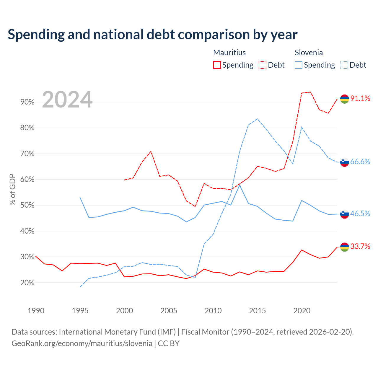 Mauritius has $13.6B in government debt (91.1% of GDP), compared to $48.6B (66.6% of GDP) in Slovenia.