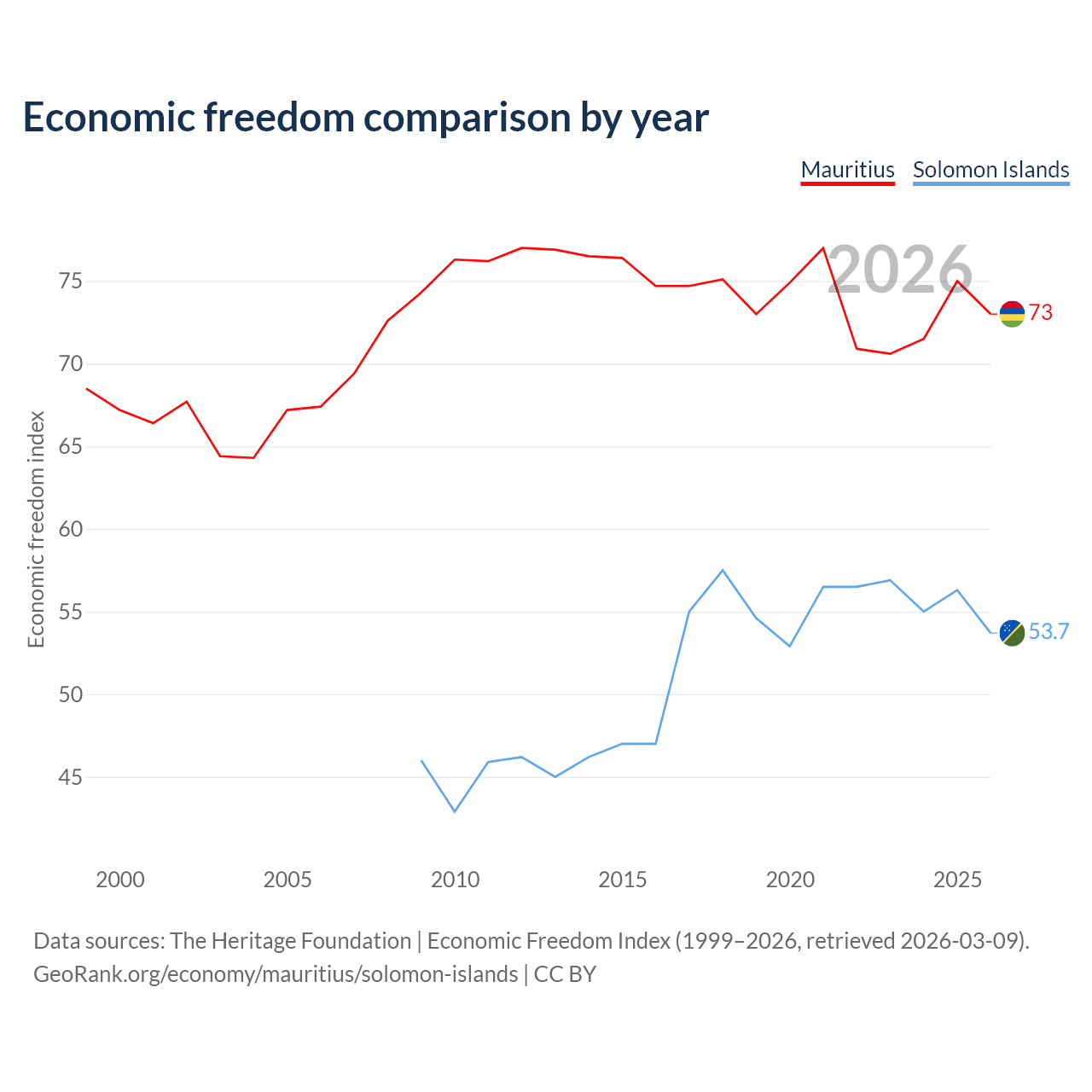 The Economic Freedom Index for Mauritius is 73, ranking 26/197, compared to 53.7 for the Solomon Islands, ranking 137/197. The chart above displays a comparison of annual changes in economic freedom indexes.