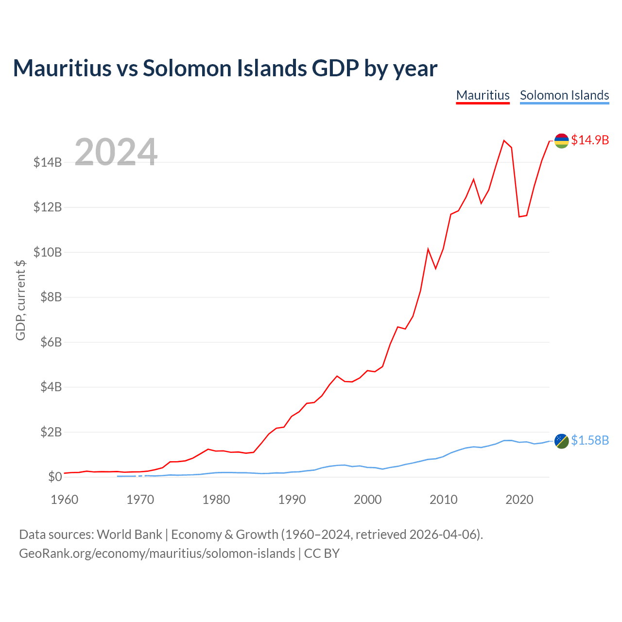 Mauritius has a GDP of $14.9B compared to $1.58B for the Solomon Islands, ranking 143/197 and 182/197 by economy size, respectively.