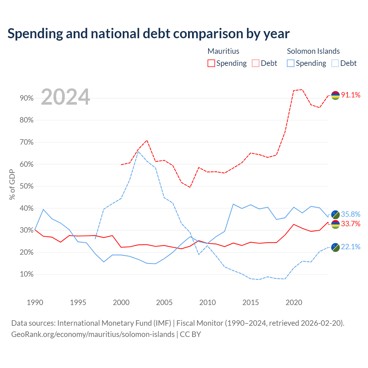 Mauritius has $13.6B in government debt (91.1% of GDP), compared to $350M (22.1% of GDP) in the Solomon Islands.