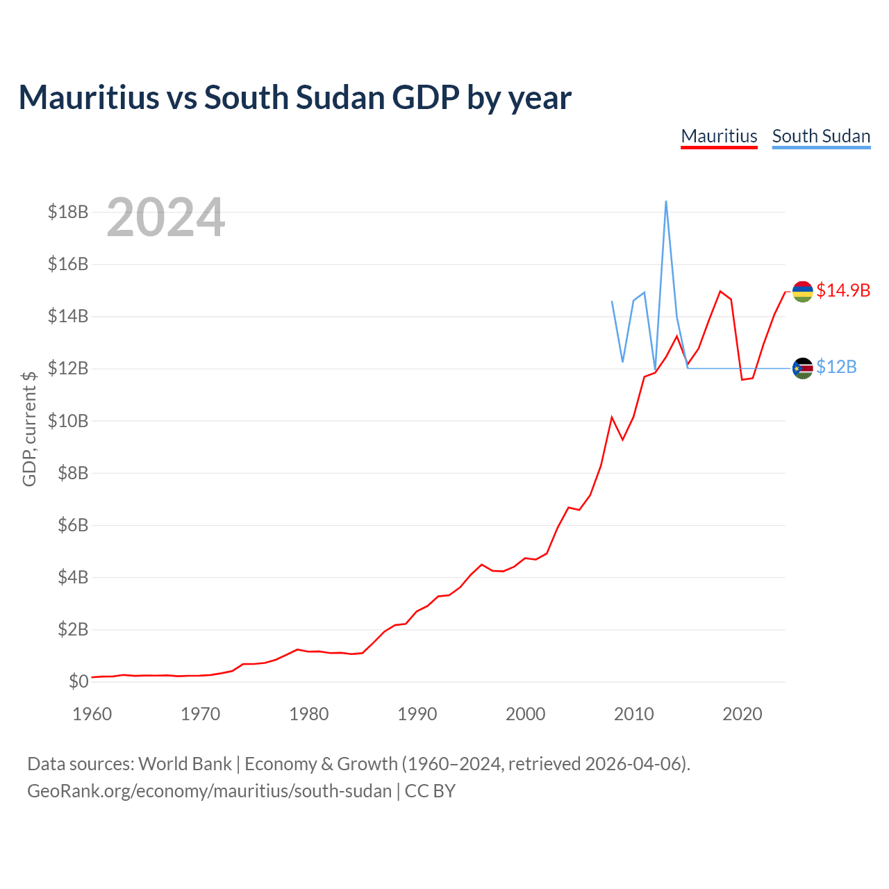 Mauritius has a GDP of $14.9B compared to $12B for South Sudan, ranking 143/197 and 149/197 by economy size, respectively.