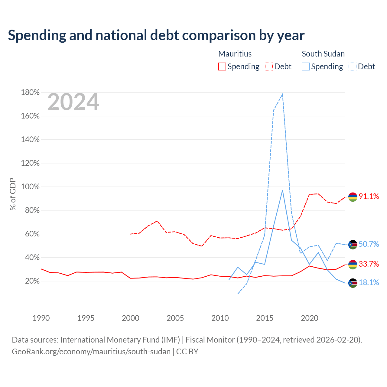 Mauritius has $13.6B in government debt (91.1% of GDP), compared to $7.04B (50.7% of GDP) in South Sudan.