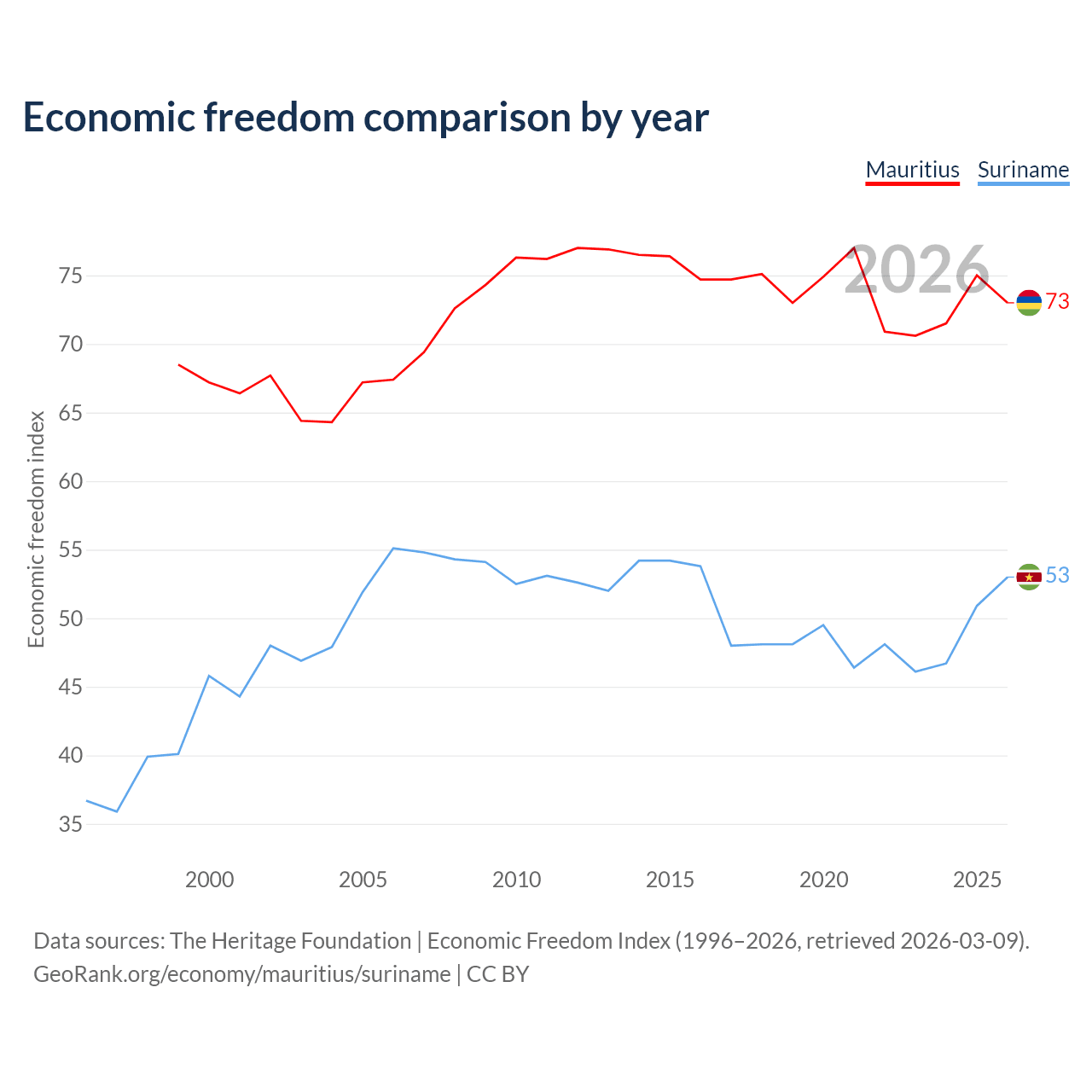 The Economic Freedom Index for Mauritius is 73, ranking 26/197, compared to 53 for Suriname, ranking 143/197. The chart above displays a comparison of annual changes in economic freedom indexes.