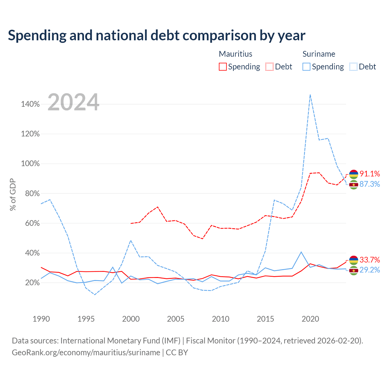 Mauritius has $13.6B in government debt (91.1% of GDP), compared to $3.86B (87.3% of GDP) in Suriname.