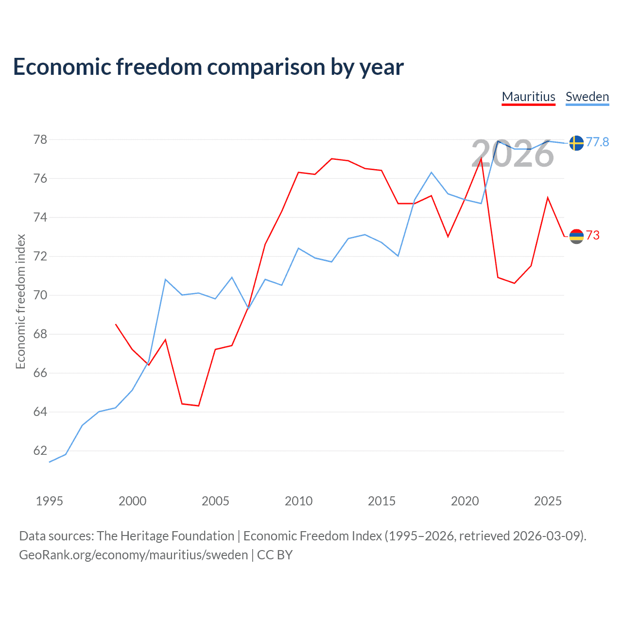 The Economic Freedom Index for Mauritius is 73, ranking 26/197, compared to 77.8 for Sweden, ranking 14/197. The chart above displays a comparison of annual changes in economic freedom indexes.