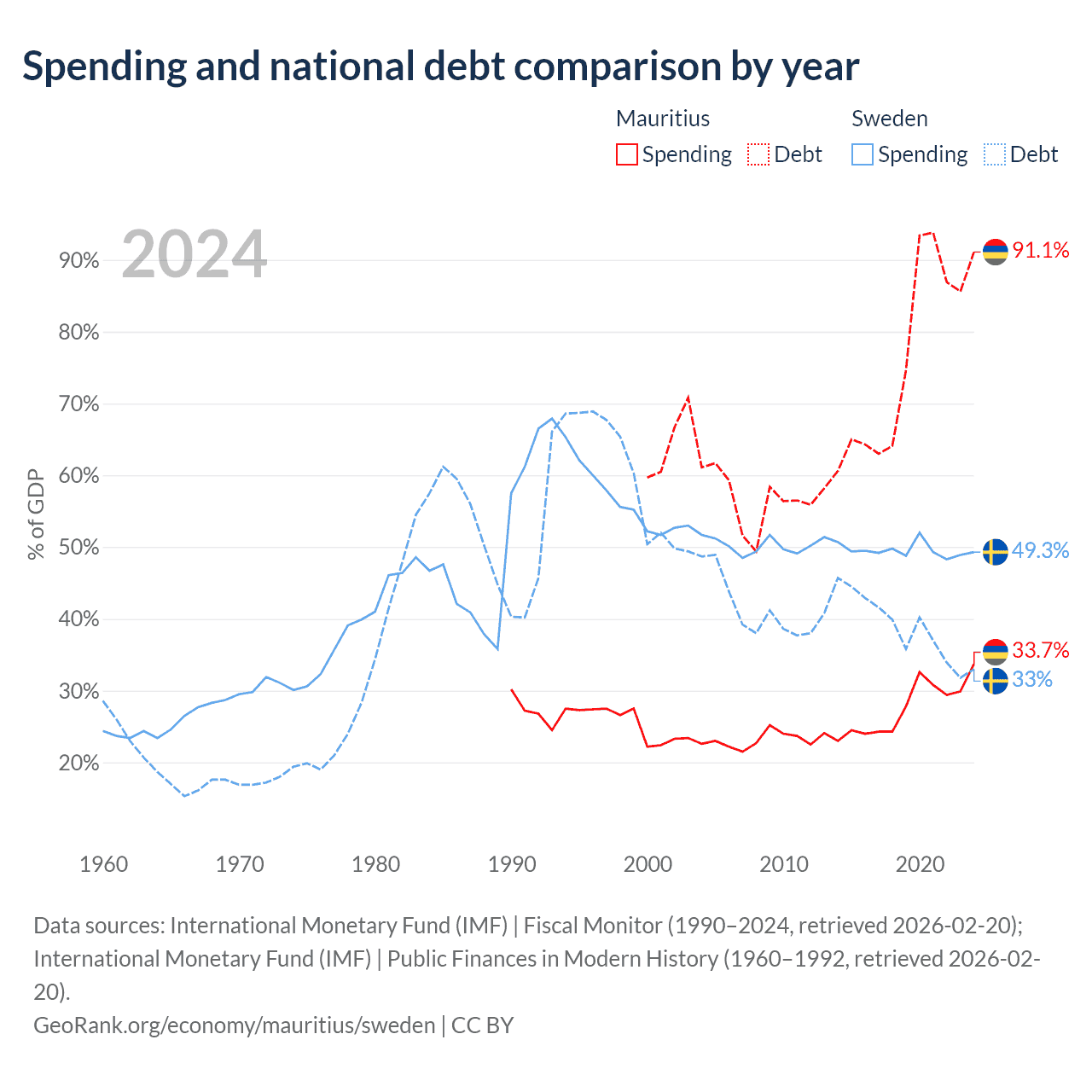 Mauritius has $13.6B in government debt (91.1% of GDP), compared to $199B (33% of GDP) in Sweden.