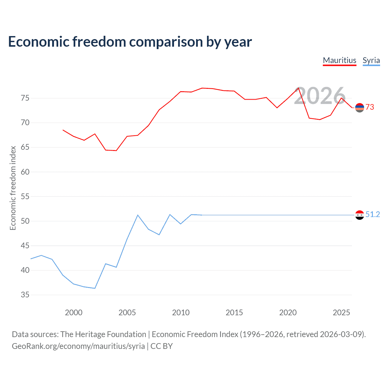 The Economic Freedom Index for Mauritius is 73, ranking 26/197, compared to 51.2 for Syria, ranking 155/197. The chart above displays a comparison of annual changes in economic freedom indexes.