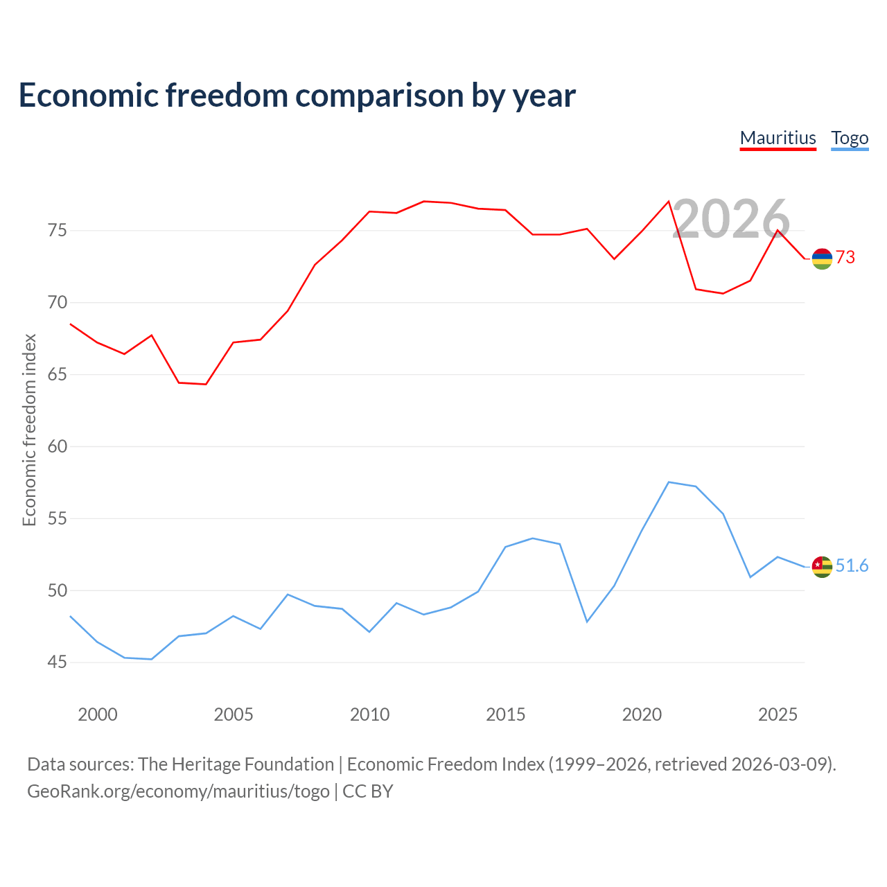 The Economic Freedom Index for Mauritius is 73, ranking 26/197, compared to 51.6 for Togo, ranking 153/197. The chart above displays a comparison of annual changes in economic freedom indexes.