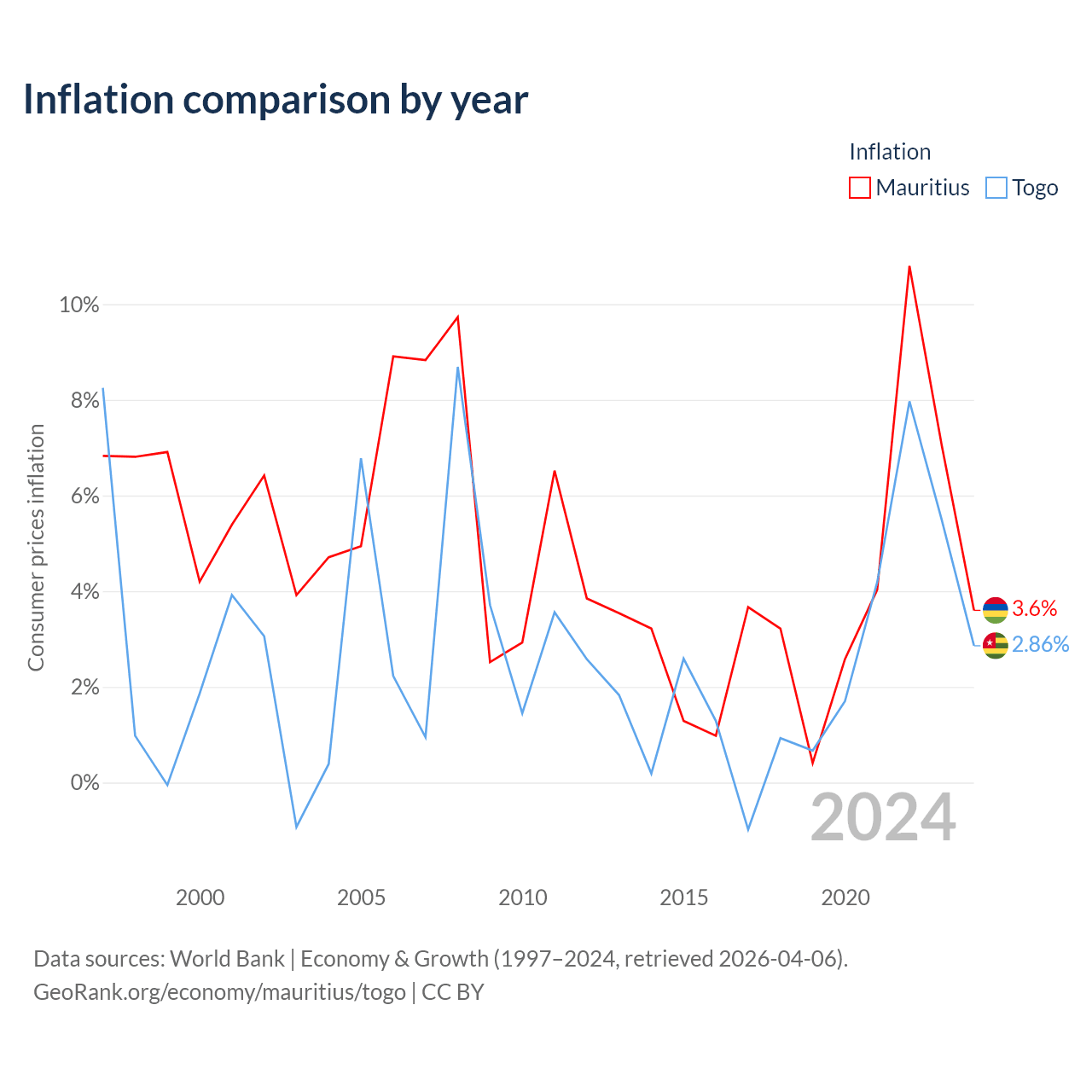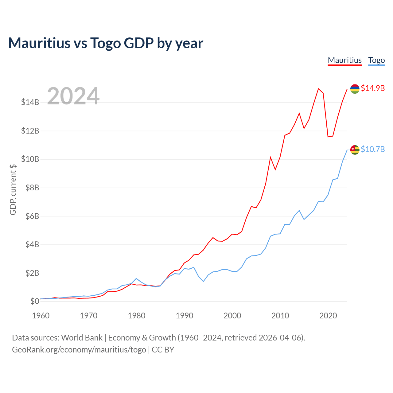 Mauritius has a GDP of $14.9B compared to $10.7B for Togo, ranking 143/197 and 154/197 by economy size, respectively.