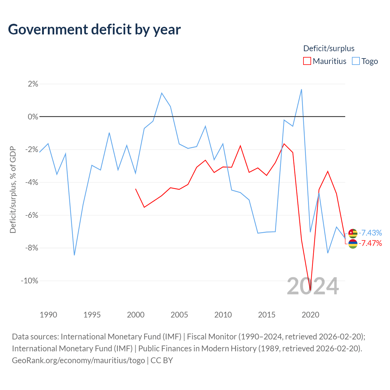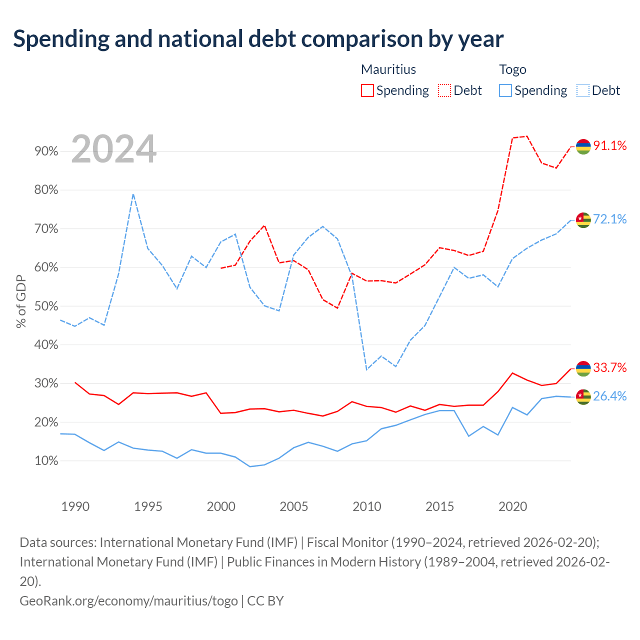Mauritius has $13.6B in government debt (91.1% of GDP), compared to $7.68B (72.1% of GDP) in Togo.