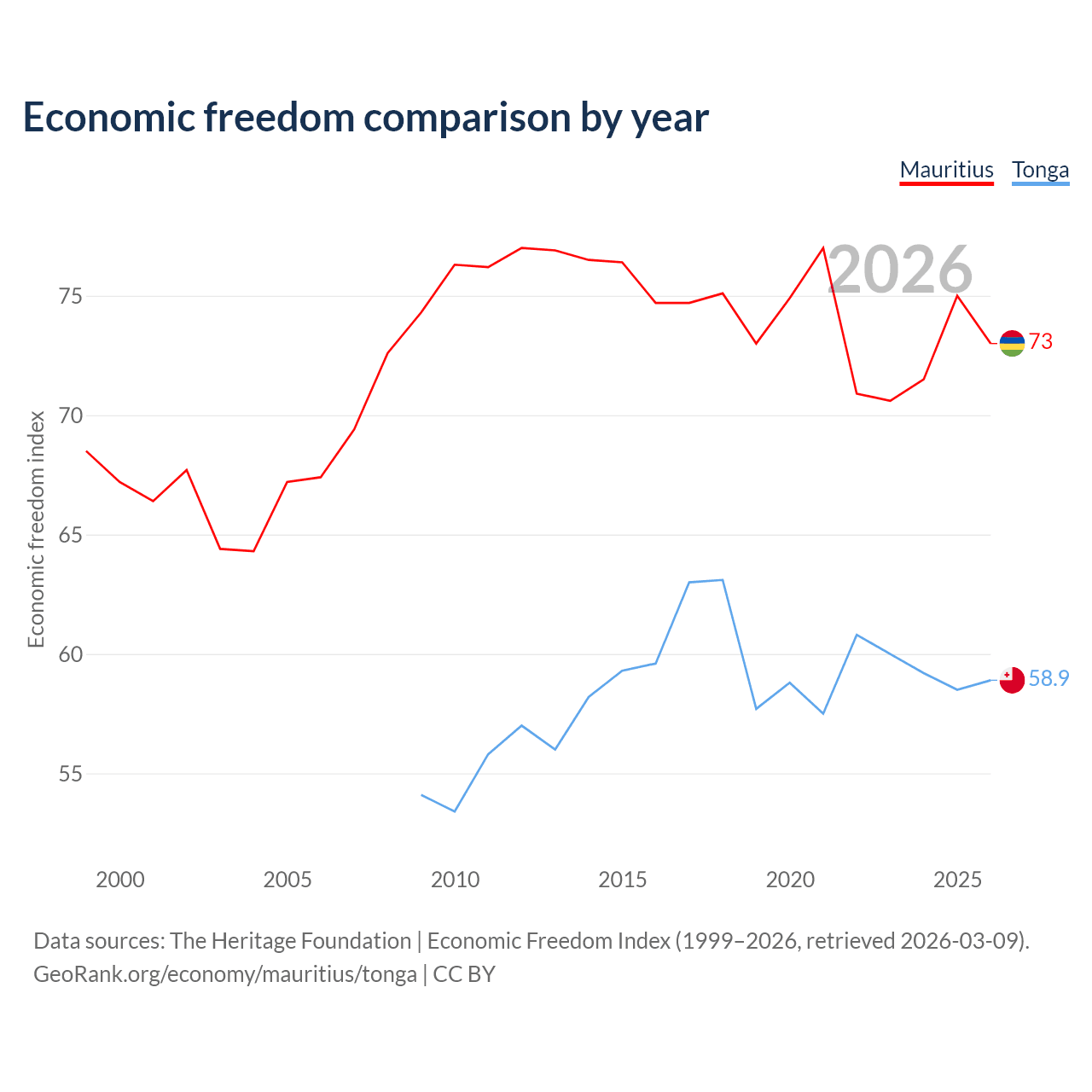 The Economic Freedom Index for Mauritius is 73, ranking 26/197, compared to 58.9 for Tonga, ranking 107/197. The chart above displays a comparison of annual changes in economic freedom indexes.