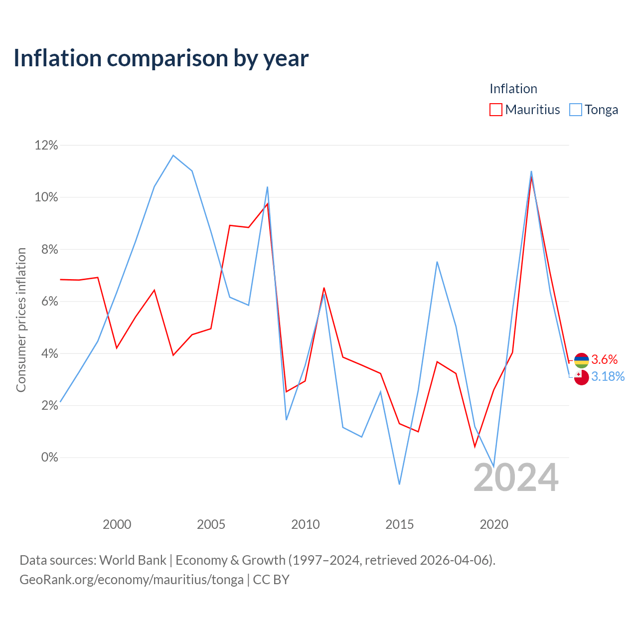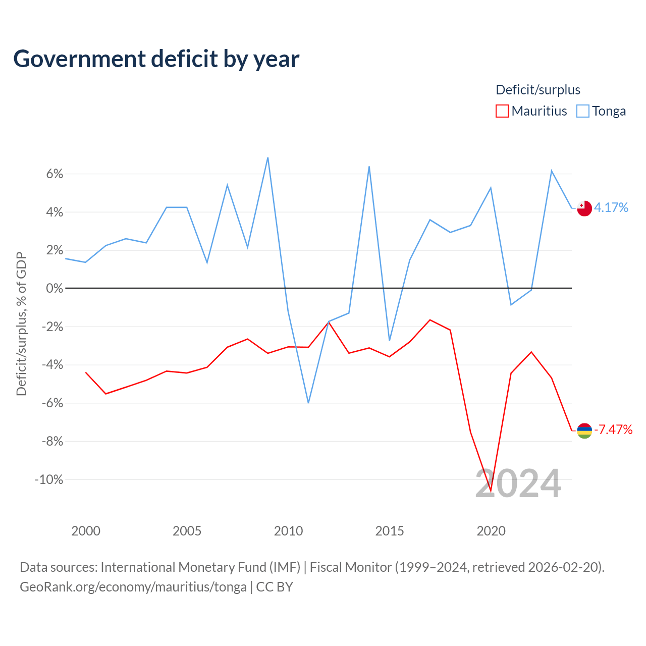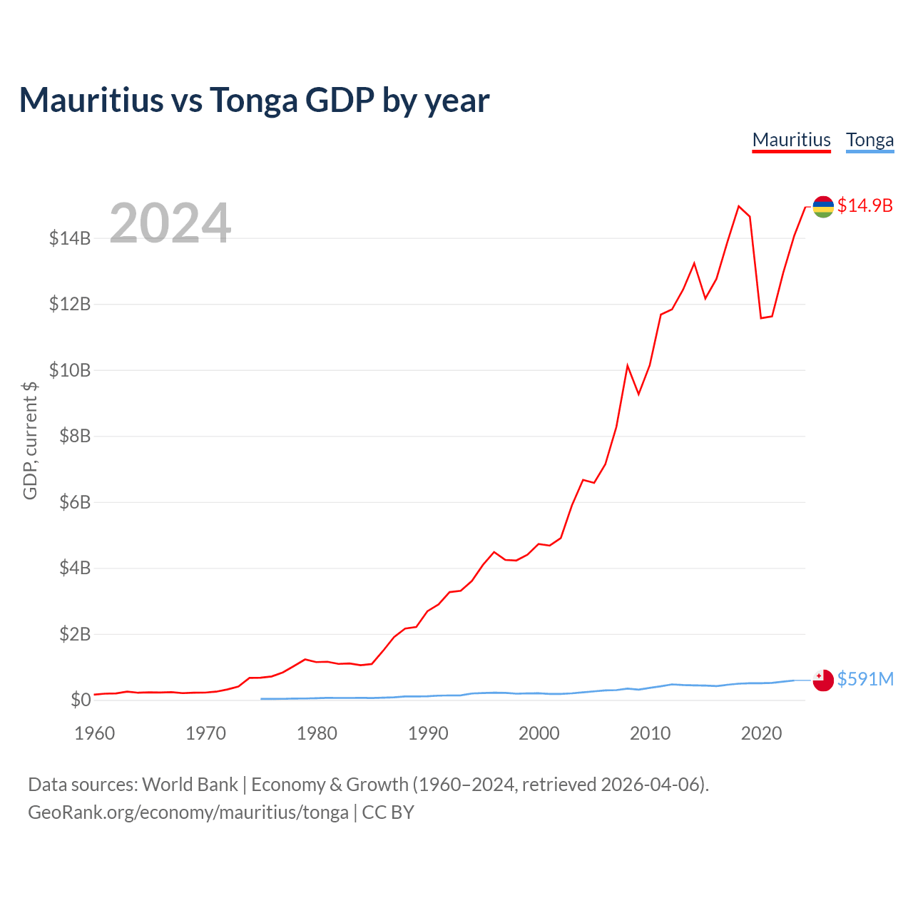 Mauritius has a GDP of $14.9B compared to $591M for Tonga, ranking 143/197 and 191/197 by economy size, respectively.