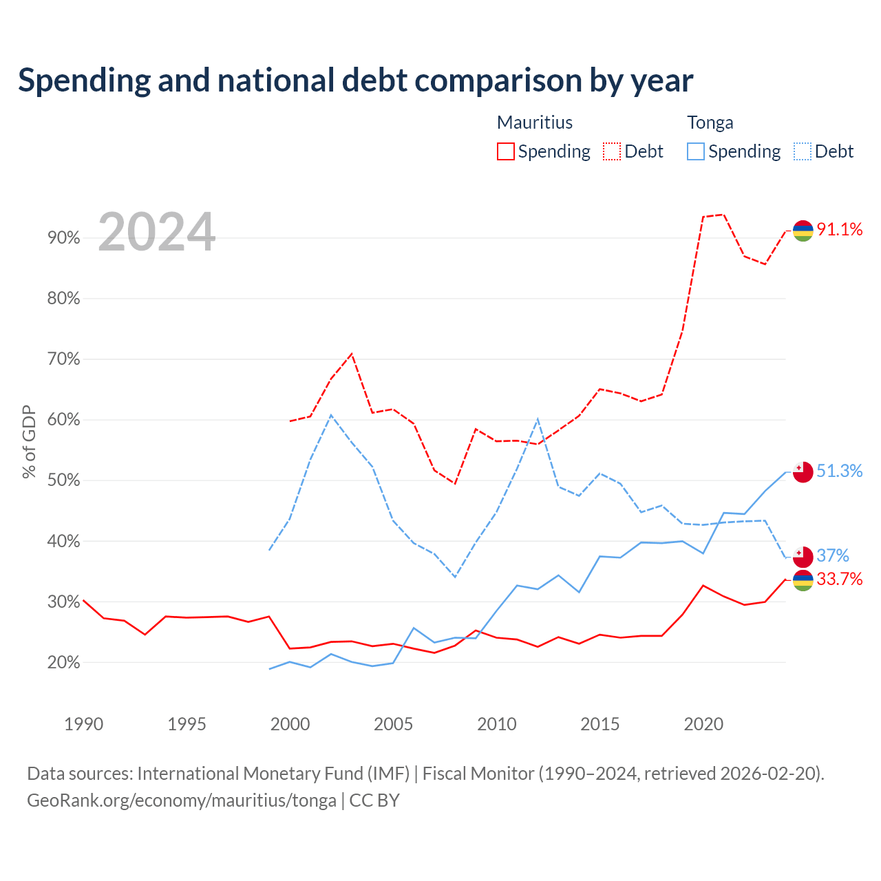 Mauritius has $13.6B in government debt (91.1% of GDP), compared to $256M (37% of GDP) in Tonga.