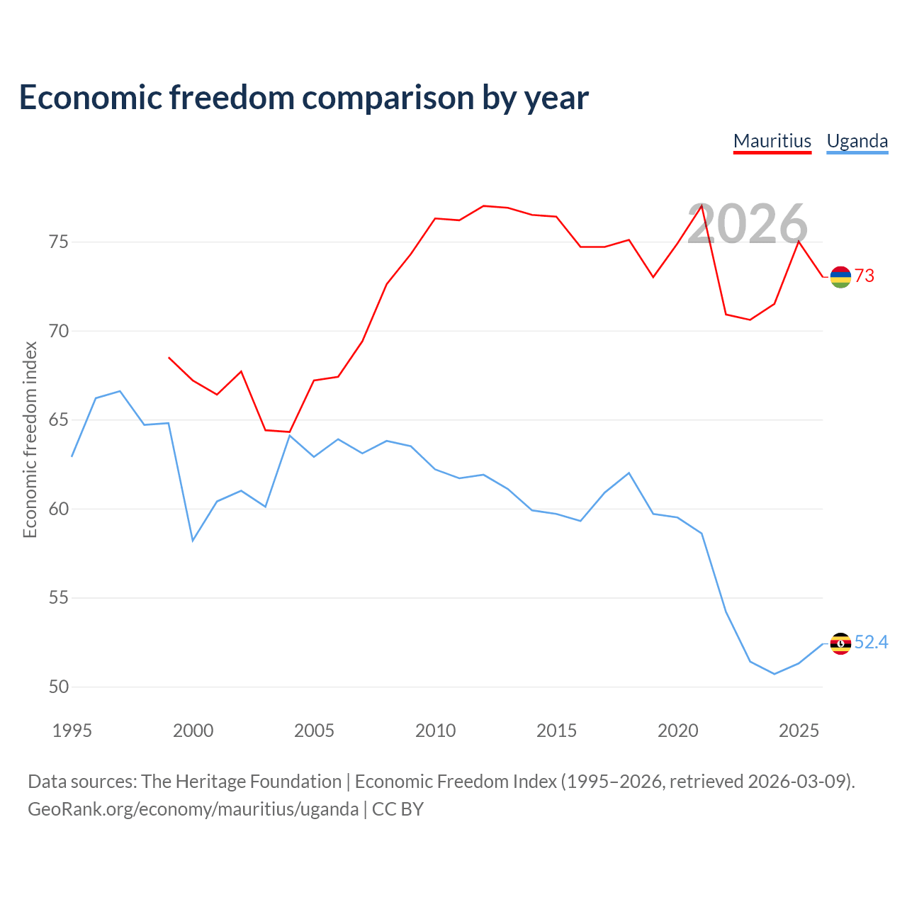 The Economic Freedom Index for Mauritius is 73, ranking 26/197, compared to 52.4 for Uganda, ranking 149/197. The chart above displays a comparison of annual changes in economic freedom indexes.