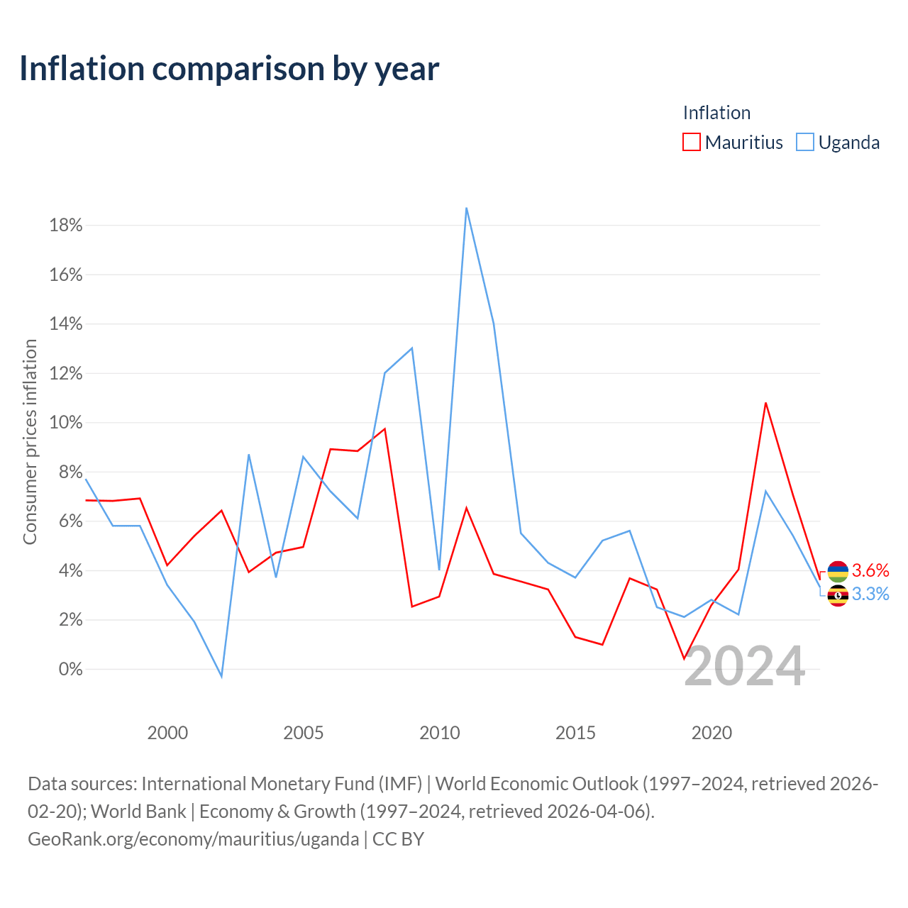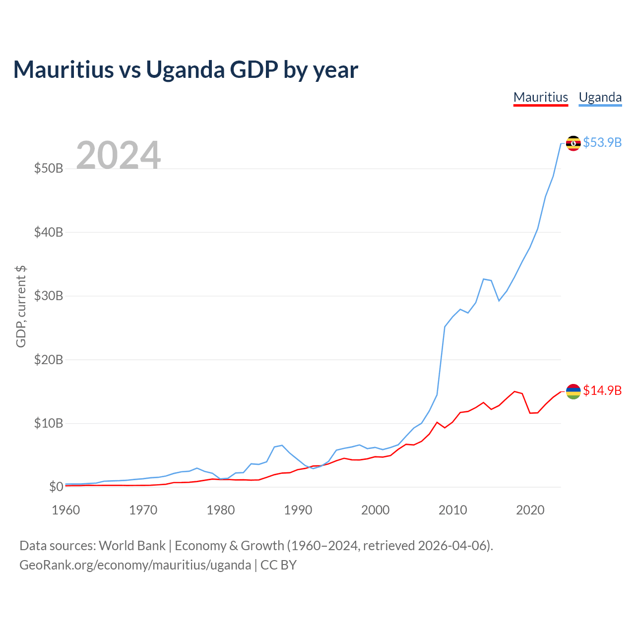 Mauritius has a GDP of $14.9B compared to $53.9B for Uganda, ranking 143/197 and 89/197 by economy size, respectively.