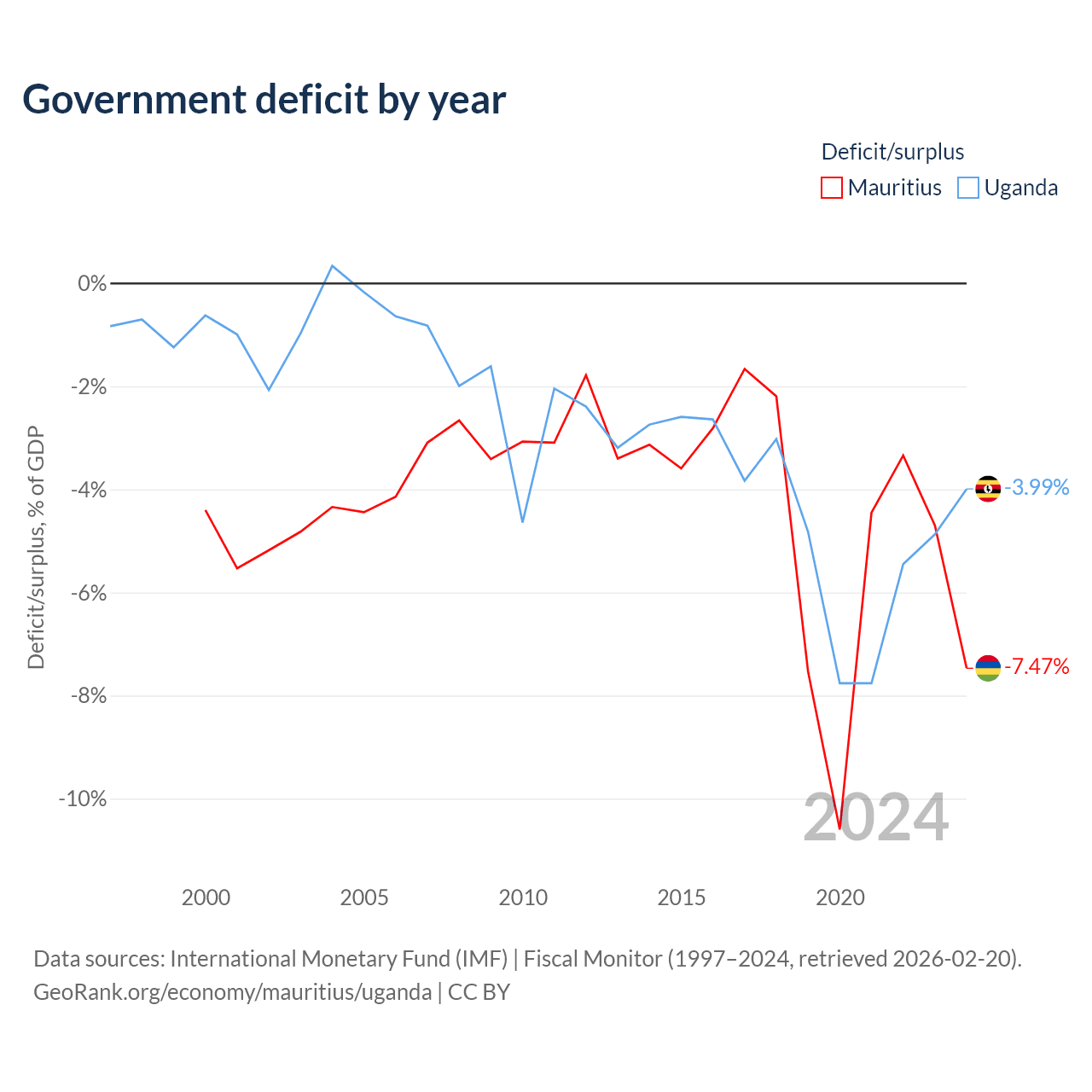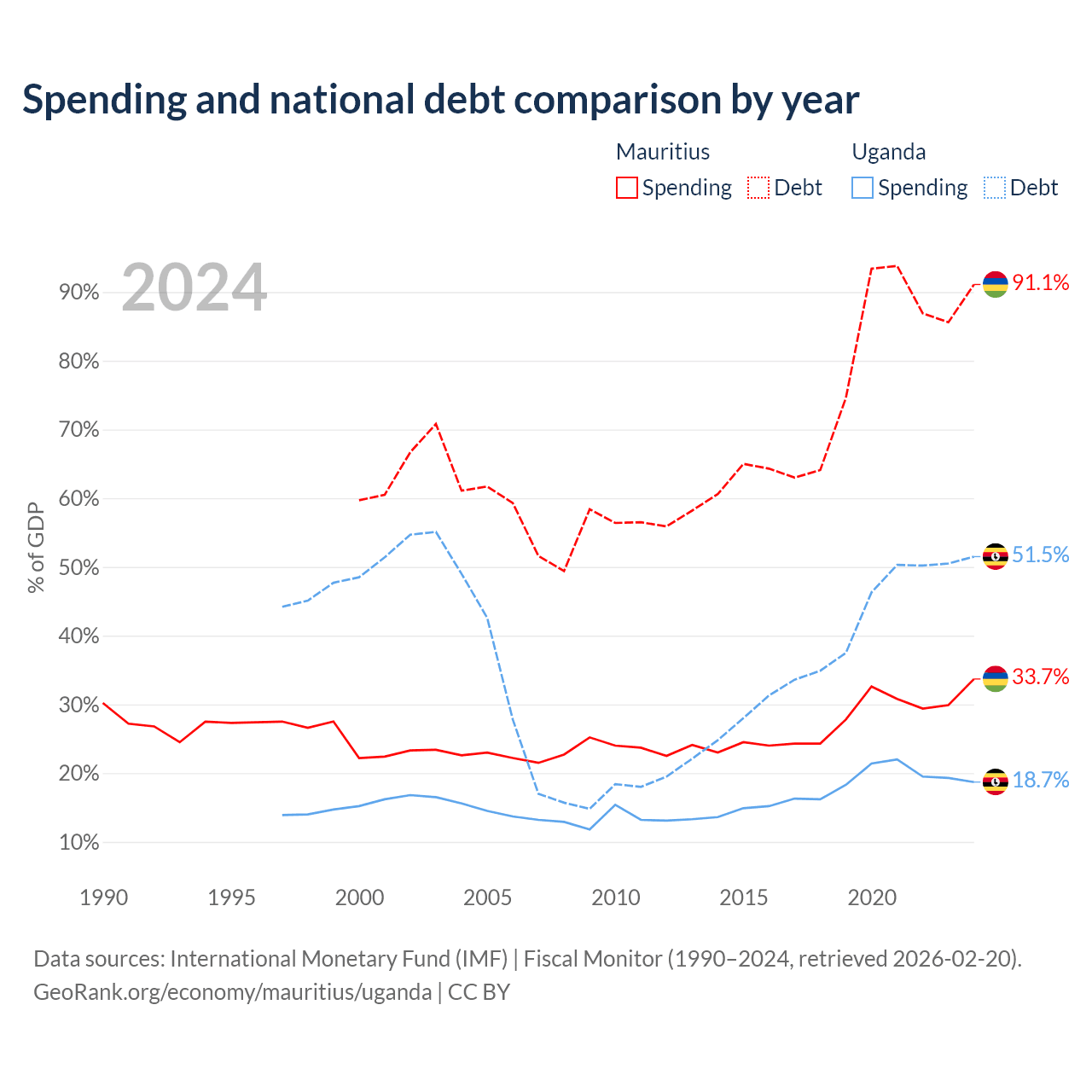 Mauritius has $13.6B in government debt (91.1% of GDP), compared to $27.8B (51.5% of GDP) in Uganda.