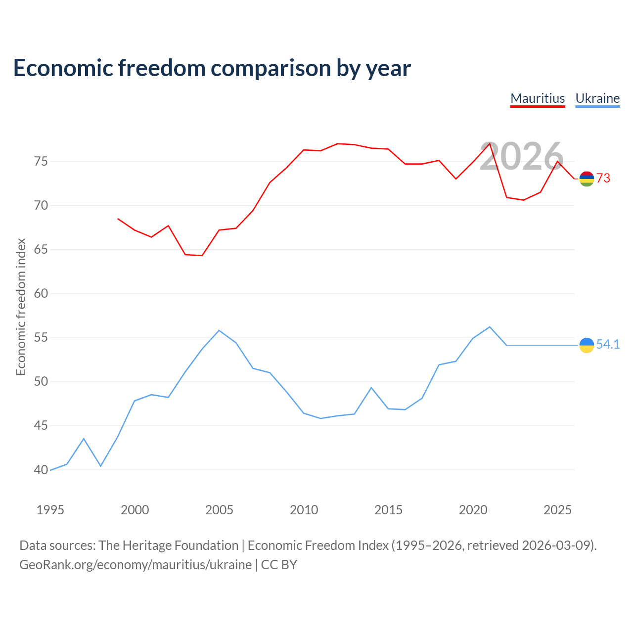 The Economic Freedom Index for Mauritius is 73, ranking 26/197, compared to 54.1 for Ukraine, ranking 135/197. The chart above displays a comparison of annual changes in economic freedom indexes.