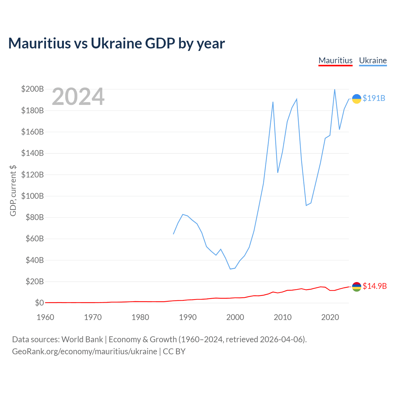 Mauritius has a GDP of $14.9B compared to $191B for Ukraine, ranking 143/197 and 57/197 by economy size, respectively.