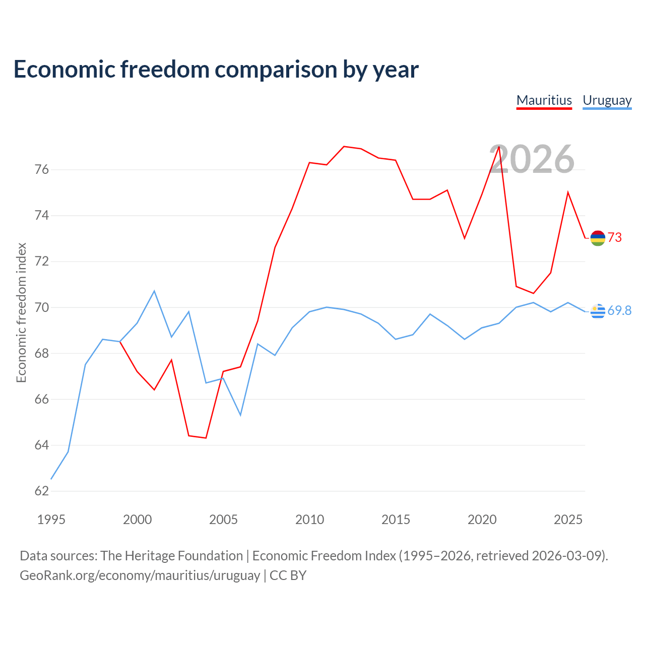 The Economic Freedom Index for Mauritius is 73, ranking 26/197, compared to 69.8 for Uruguay, ranking 39/197. The chart above displays a comparison of annual changes in economic freedom indexes.