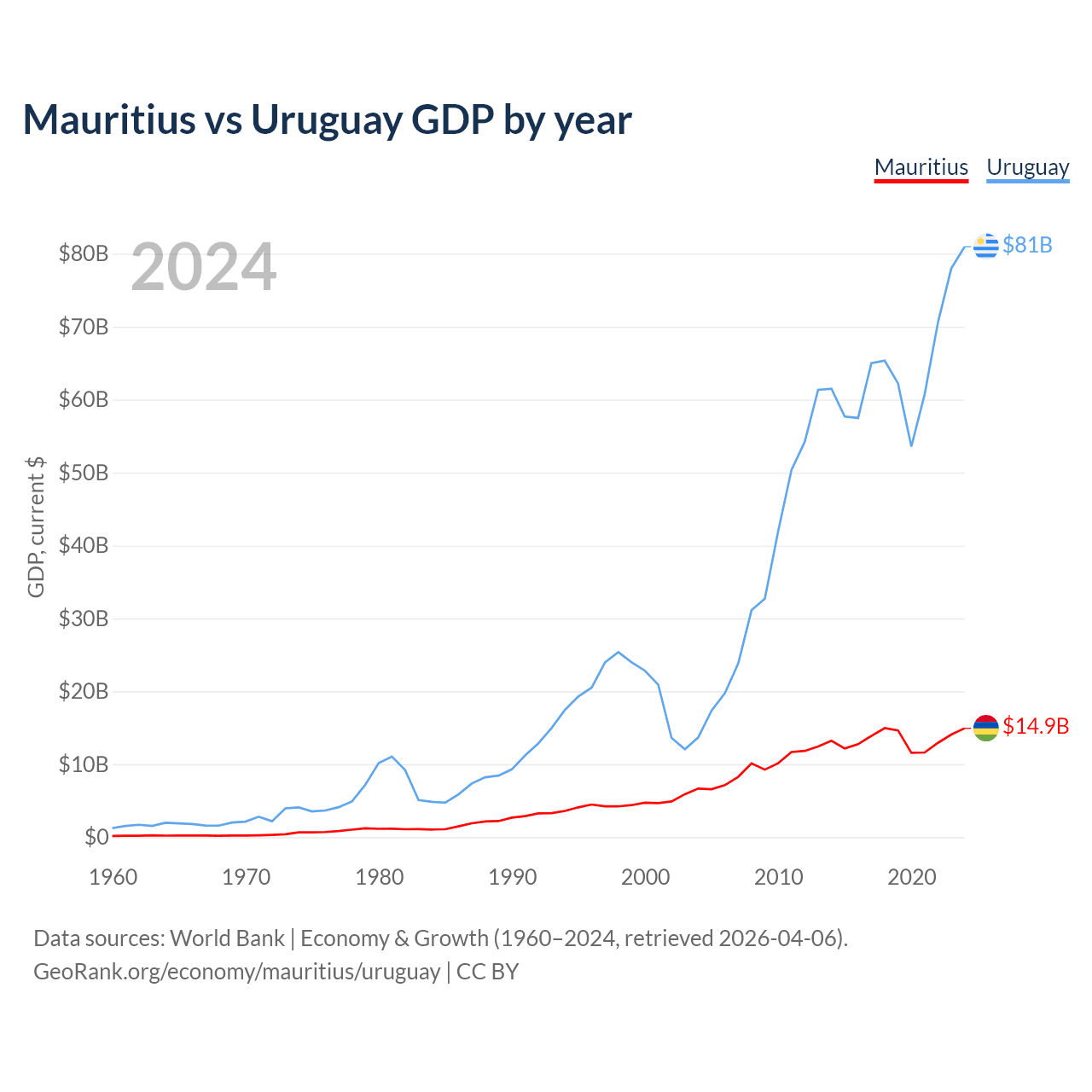 Mauritius has a GDP of $14.9B compared to $81B for Uruguay, ranking 143/197 and 81/197 by economy size, respectively.