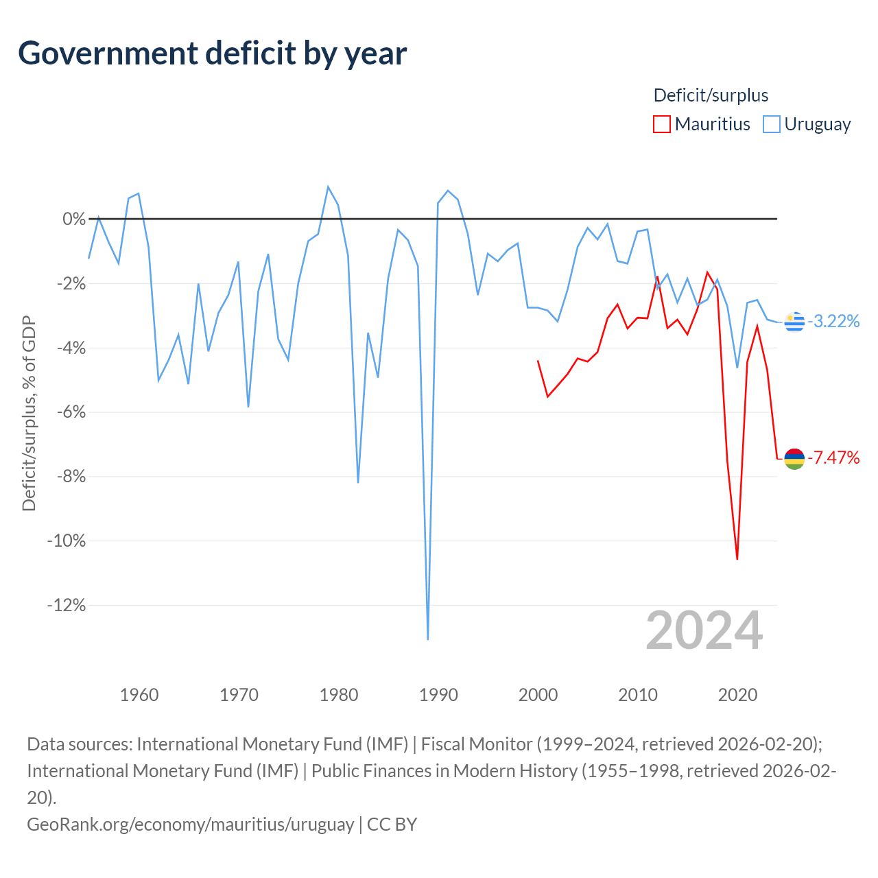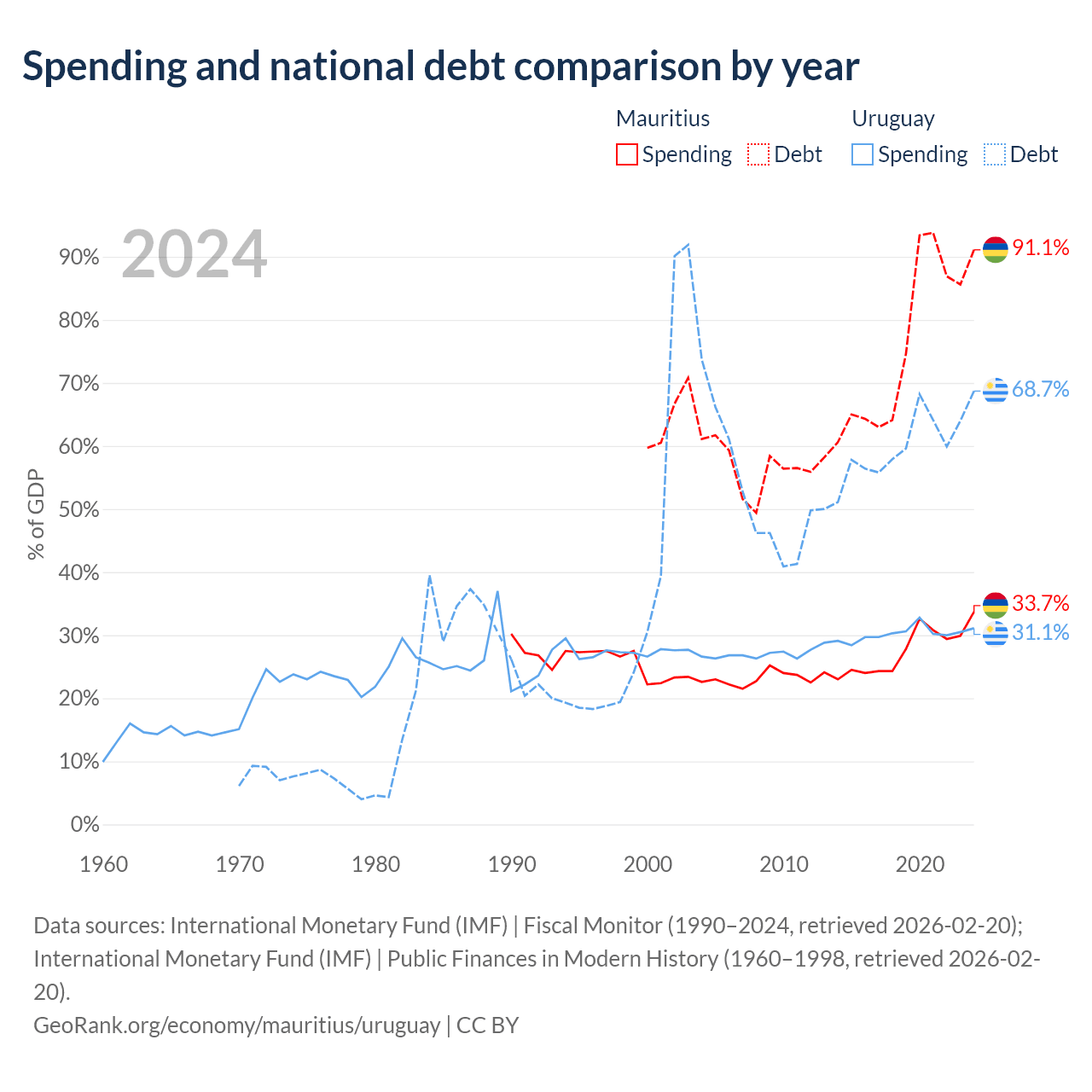 Mauritius has $13.6B in government debt (91.1% of GDP), compared to $55.6B (68.7% of GDP) in Uruguay.