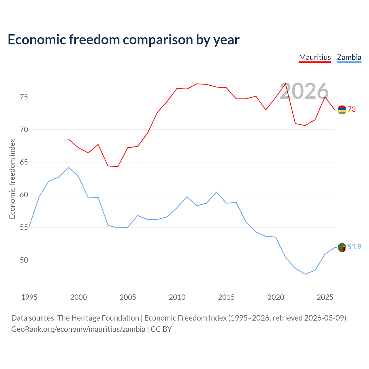 The Economic Freedom Index for Mauritius is 73, ranking 26/197, compared to 51.9 for Zambia, ranking 152/197. The chart above displays a comparison of annual changes in economic freedom indexes.