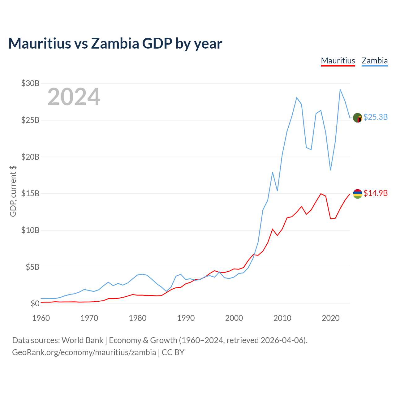 Mauritius has a GDP of $14.9B compared to $25.3B for Zambia, ranking 143/197 and 116/197 by economy size, respectively.