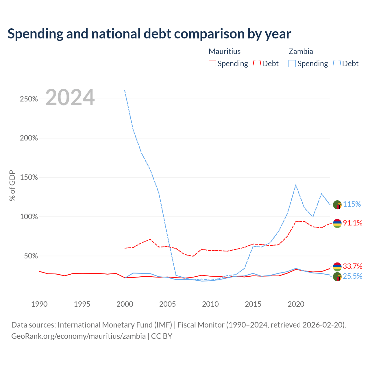 Mauritius has $13.6B in government debt (91.1% of GDP), compared to $29.1B (114.9% of GDP) in Zambia.
