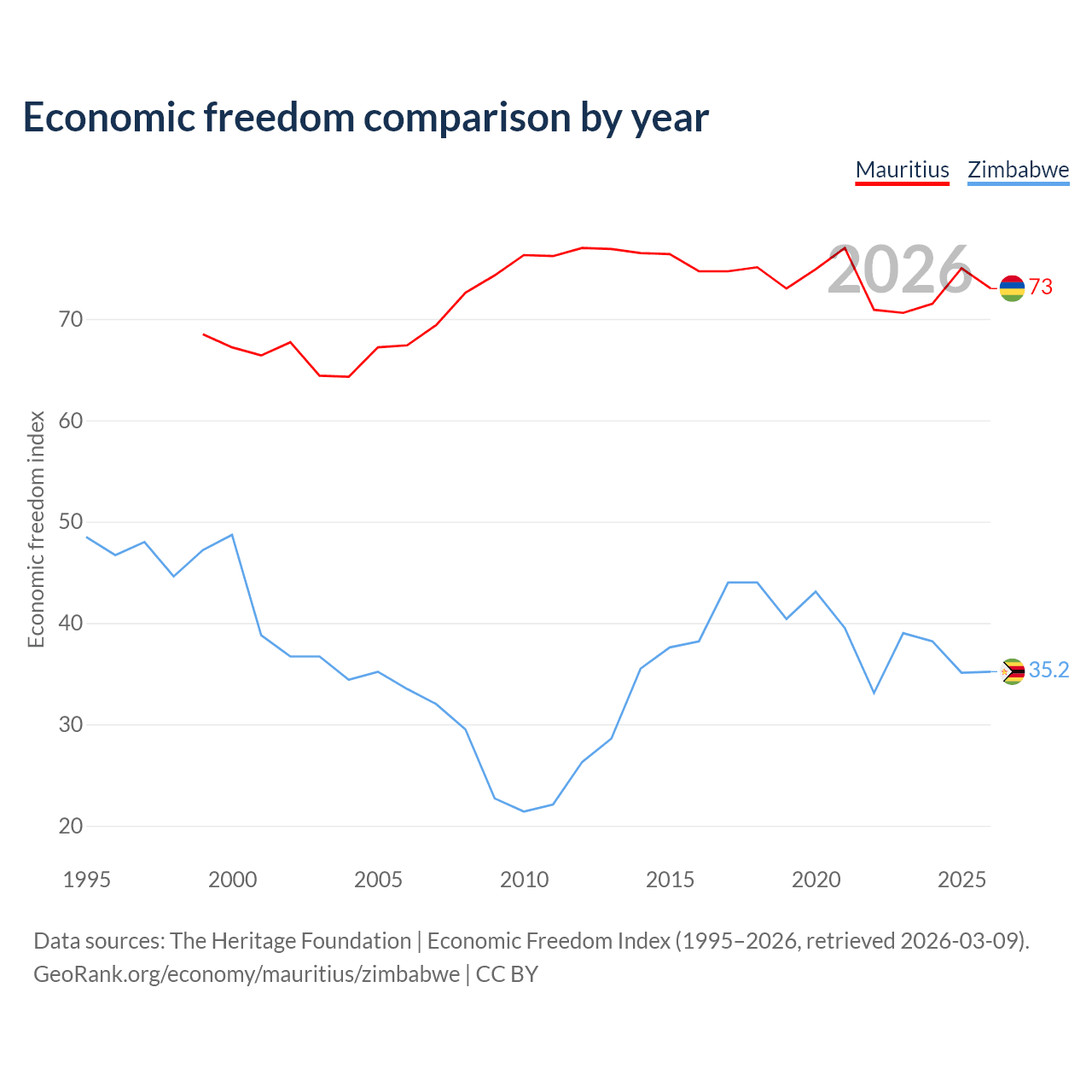 The Economic Freedom Index for Mauritius is 73, ranking 26/197, compared to 35.2 for Zimbabwe, ranking 190/197. The chart above displays a comparison of annual changes in economic freedom indexes.