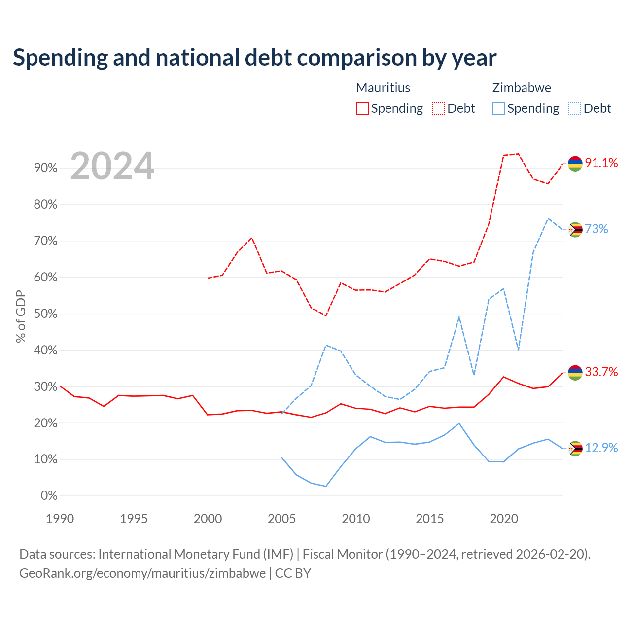 Mauritius has $13.6B in government debt (91.1% of GDP), compared to $30.3B (73% of GDP) in Zimbabwe.