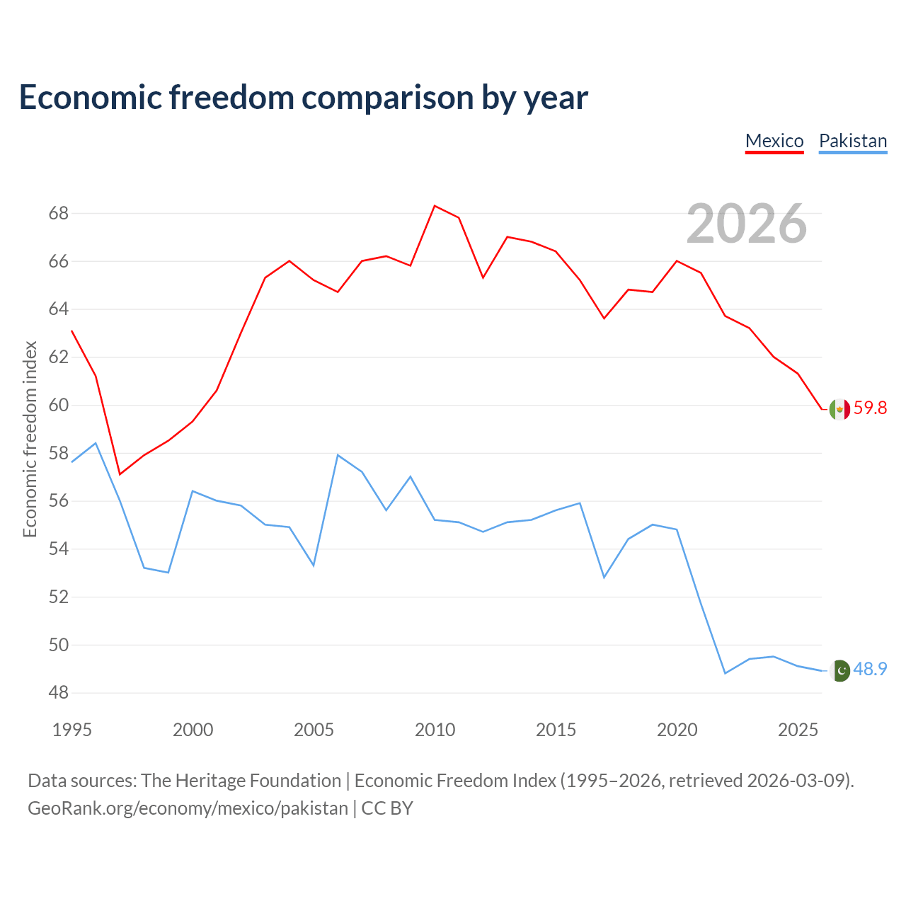 Data sources: The Heritage Foundation | Economic Freedom Index (1995–2026, retrieved 2026-03-09).