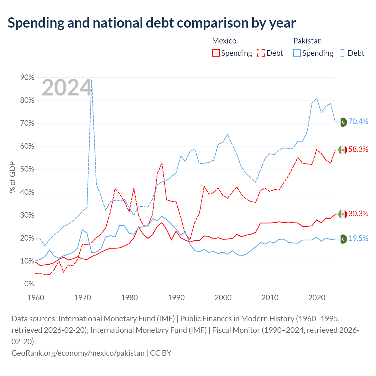 Mexico has $1.08T in government debt (58.3% of GDP), compared to $262B (70.4% of GDP) in Pakistan.